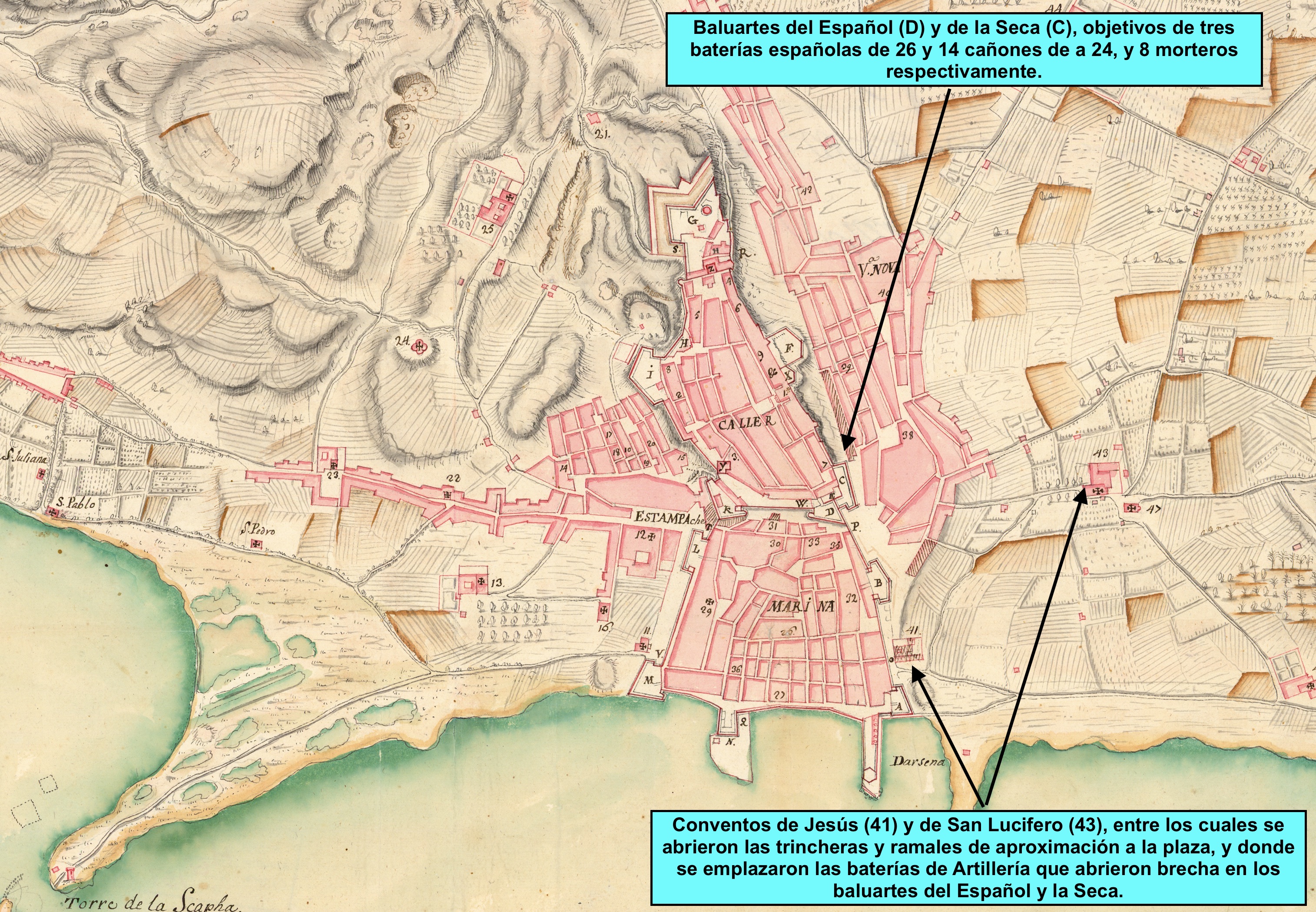 Emplazadas unas pocas piezas frente al arrabal de la Marina, sus fuegos posibilitaron la ocupación de éste por los españoles una noche, en que los defensores desalojaron el lugar y las tropas españolas se dispararon entre ellas debido a la confusión y la escasa coordinación del ataque. Acto seguido se comenzaron los trabajos para el emplazamiento dos baterías contra la plaza, una de 26 cañones y otra de 14 cañones, todos ellos de a 24, para disparar contra los baluartes del Español (o del Espolón) y de la Seca; y una tercera batería con 8 morteros para batir la plaza con objeto que los residentes solicitasen al virrey la rendición.