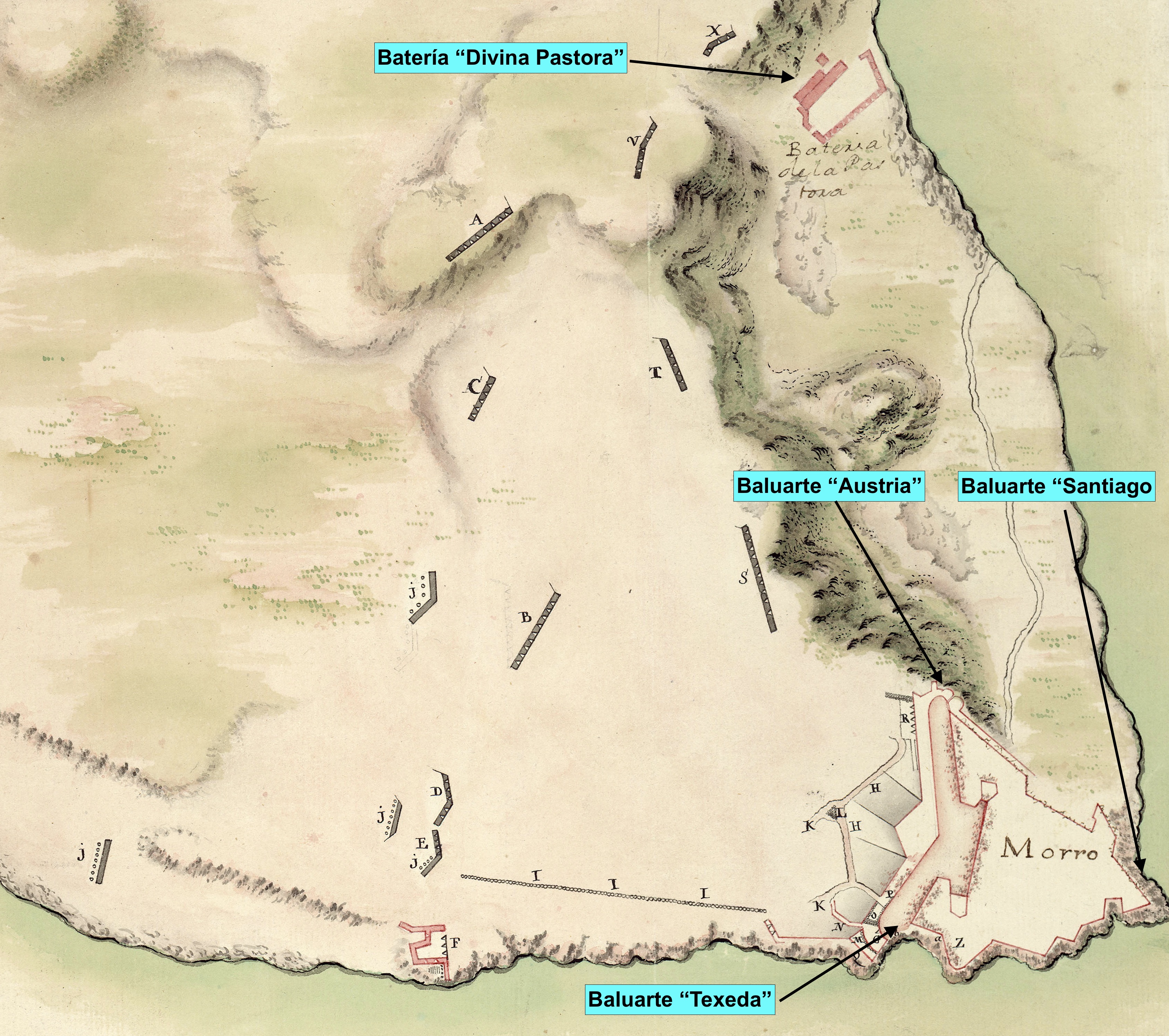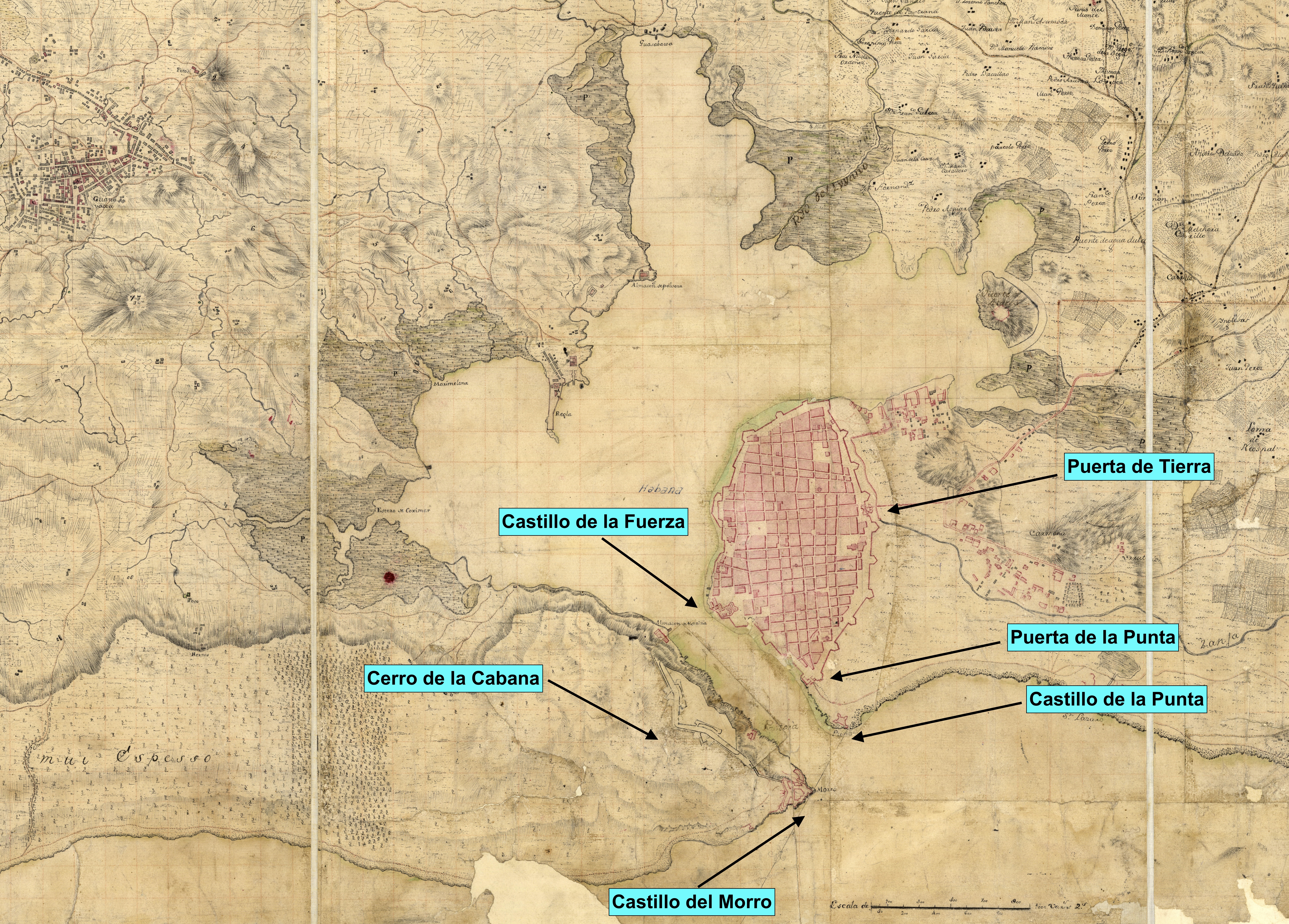 El CASTILLO DEL MORRO era la principal defensa de la ciudad, considerada la llave de la plaza. Había sido proyectado en 1585 por el ingeniero Bautista Antonelli, dentro del Plan específico de Defensa del área del Caribe llevado a cabo este ingeniero según instrucciones del monarca Felipe II, y construido entre 1589 y 1630 por el propio Antonelli y el maestre de campo y gobernador de Cuba, experto en fortificaciones, don Juan de Texeda. Su perímetro era de 850 varas, equivalentes a 710 metros, ocupando la cima de un saliente rocoso sobre el mar de unos 22 pies de alto (unos 6 metros). Sus murallas se alzaban otros 22 pies (otros 6 metros) sobre el suelo. Sus frentes se adaptaban al suelo formando un polígono irregular de tres lados, adaptado al peñasco por un sistema de terrazas; el frente de tierra, el de la puerta principal, tenía un foso delante, un revellín en el centro y dos baluartes en sus extremos: el baluarte que daba del mar era el “Texeda”, y el que daba a la bahía era el de “Austria”; el tercer baluarte era el “Santiago” miraba hacia la entrada a la bahía. Sus muros tenían tres metros de espesor.
