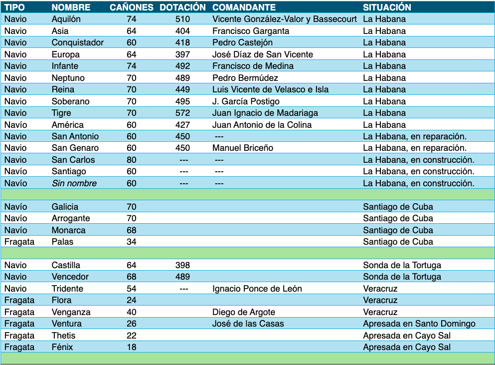 En 1761 el gobierno españo, decidió aumentar la escuadra de la Habana, pasando de 6 navíos y 3 fragatas a 18 navíos y 6 fragatas. En el momento de la llegada de los ingleses, la escuadra anclada en el puerto de la Habana estaba formada por 10 navíos de línea en activo (Aquilón, Asia, Conquistador, Europa, Infante, Neptuno, Reina, Soberano y Tigre), dos en reparación (San Antonio y San Genaro) y tres en construcción en el astillero (San Carlos, San Antonio y un tercero sin bautizar aún); se habían enviado tres navíos de dotación a Santiago de Cuba (Galicia, Arrogante y Monarca) y otros tres navíos estaban cumpliendo misiones en Veracruz o en su camino (Castilla, Vencedor y Tridente). De las seis fragatas de la escuadra, una estaba de dotación Santiago de Cuba junto a los tres navíos (Palas), dos estaban en Veracruz (Venganza y Flora); una había sido apresada en febrero por corsarios ingleses en aguas de Santo Domingo y llevada a Jamaica (Ventura) y dos tuvieron un encuentro con la flota británica el 2 de junio y fueron apresadas (Thetis) y Félix). El siguiente cuadro muestra la relación detallada de la situación de la escuadra de Cuba[01]: