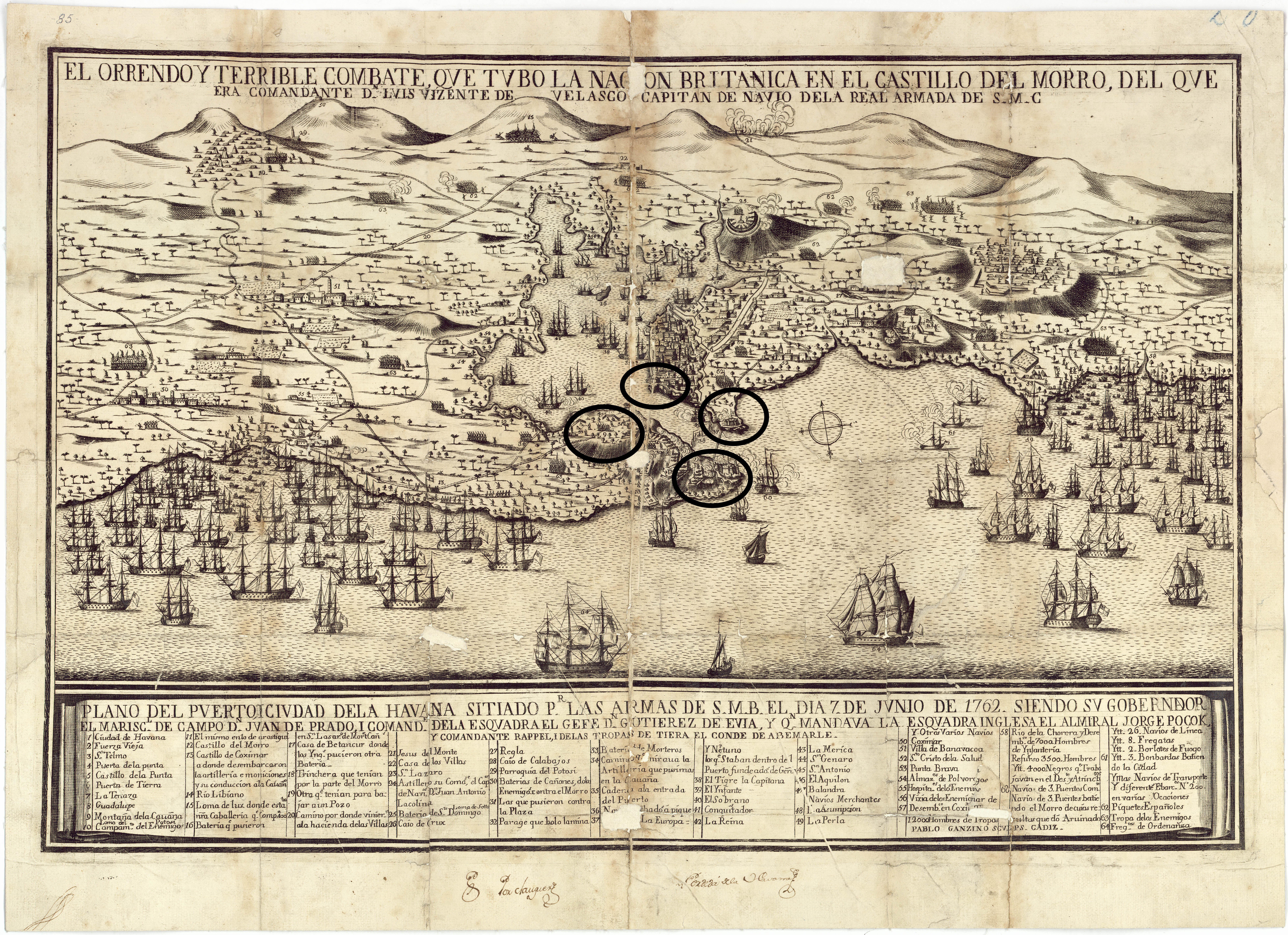 [05] "Relación de la acción de la Escuadra de S.M.B. mandada por el Almirante don Jorge Pocotk, y operaciones del Exército mandado por el Excmo. Sr. Conde de Albermarle, Teniente Gral. y Comandante en Gefe de la Expedición hecha contra la Ciudad de la Havana, y disposiciones que ésta tomó para su defensa desde el 6 de Junio hasta su rendición en 12 de Agosto del Año de 1762". Servicio Histórico Militar, signatura 6.743, 4-1-1-7. Citado por Zapatero en op. cit., pág. 298.