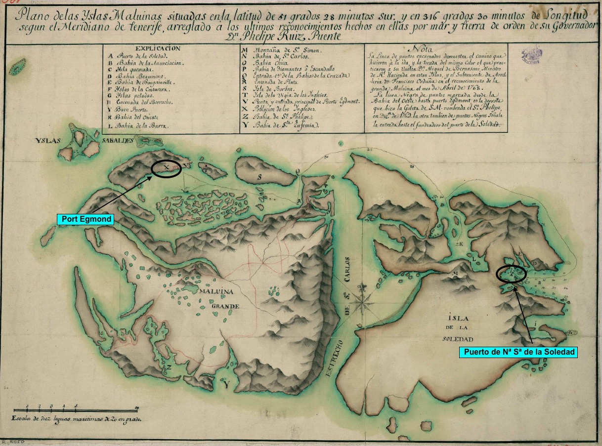 El 1 de abril de 1767, Bougainville hizo entrega oficialmente de Port-Louis al capitán de navío don Felipe Ruiz Puente, quien le cambió el nombre por el de Puerto de Nuestra Señora de la Soledad, y se convirtió en el primer gobernador español de la isla, dependiente del gobierno de Buenos Aires, en ese momento ocupada por Francisco de Paula Bucareli, hermano del virrey de Nueva España. A partir de entonces los franceses nunca más reclamaron derecho alguno sobre las islas, y España añadió los derechos cedidos de Francia de ser la primera ocupante, a sus derechos de descubridores del archipiélago.