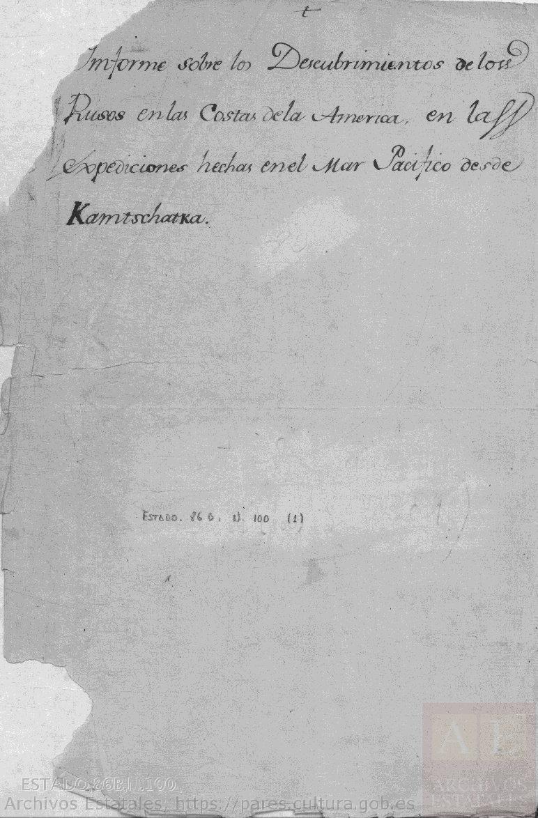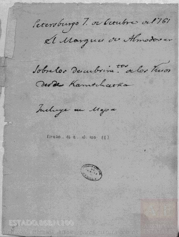 Informe del marqués de Almodóvar, don Pedro de Góngora y Luján, ministro plenipotenciario español en San Petersburgo, dirigido al Exmo. Sr. don Ricardo Wall y Devereux, secretario de Estado del reino de España, sobre los descubrimientos realizados por exploradores rusos en aguas del Pacífico norte desde la península de Kamtchatka, fechado el 7 de octubre de 1761.