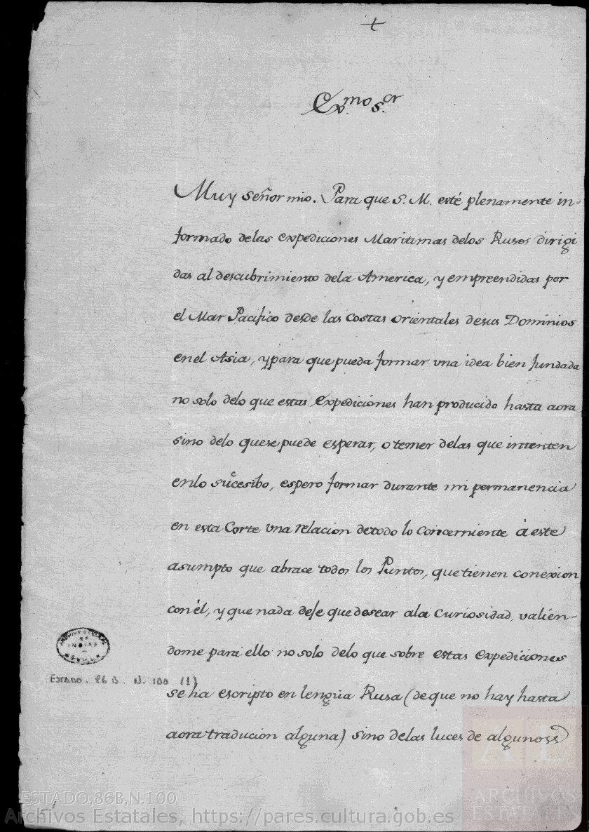 Muy señor mío: Para que S.M. esté plenamente informado de las expediciones marítimas de los Rusos dirigidos al descubrimiento de la América, y emprendidas por el Mar Pacífico desde las costas orientales de sus Dominios en el Asia, y para que pueda formar una idea bien fundada no solo de lo que estas expediciones han producido hasta aora sino de lo que se puede esperar, o temer de las que intenten en lo sucesibo, espero formar durante mi permanencia en esta Corte una relación de todo lo concerniente a este asumpto que abrace todos los Puntos, que tienen conoexión con él, y que nada deje de desear a la curiosidad, valiéndome para ello no solo de lo que sobre estas expediciones se ha escrito en lengua rusa (de que no hay hasta aora traducción alguna) sino de las luces de algunos Académicos con quienes ya tengo introducida esta combersación, y aun de las noticias de algunos Oficiales que se allaron en ellas, y que procuraré conocer y tratar con disimulo, y sin afectación.