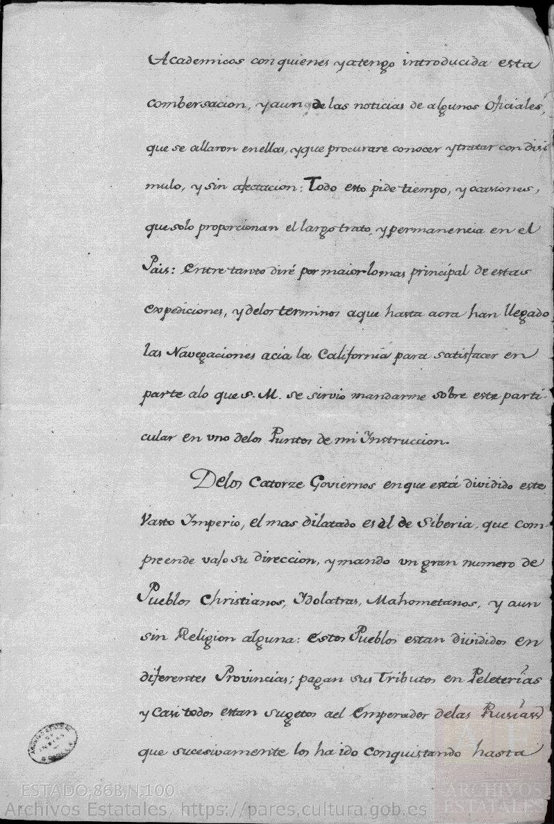 De los Catorce Goviernos en que está dividido este Vasto Imperio, el más dilatado es el de Siberia, que comprende vajo su dirección y mando un gran número de Pueblos Christianos, Ydólatras, Mahometanos, y aun sin Religión alguna: Estos Pueblos están divididos en diferentes Provincias: pagan sus Tributos en Peleterías y casi todos están sugetos a el Emperador de las Rusias que sucesivamente los ha ido conquistando hasta encontrar las costas orientales del Mar del Sur, y las septentrionales del Glacial en las extremidades del Asia.