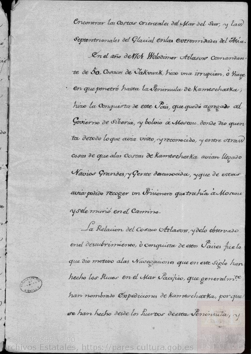 La Relación del cosaco Atlosow, y de lo observado en el descubrimiento, o conquista de estos Paises fue lo que dio motivo a las Navegaciones que en este Siglo han hecho los Rusos en el Mar Pacífico, que generalmente han nombrado Expediciones de Kamtschatka, porque se han hecho desde los Puertos de esta Península, y especialmente desde el de Avatscha que esté entre 50 y 55 grados de latitud, y como a 175 de longitud.