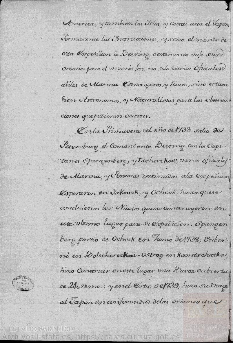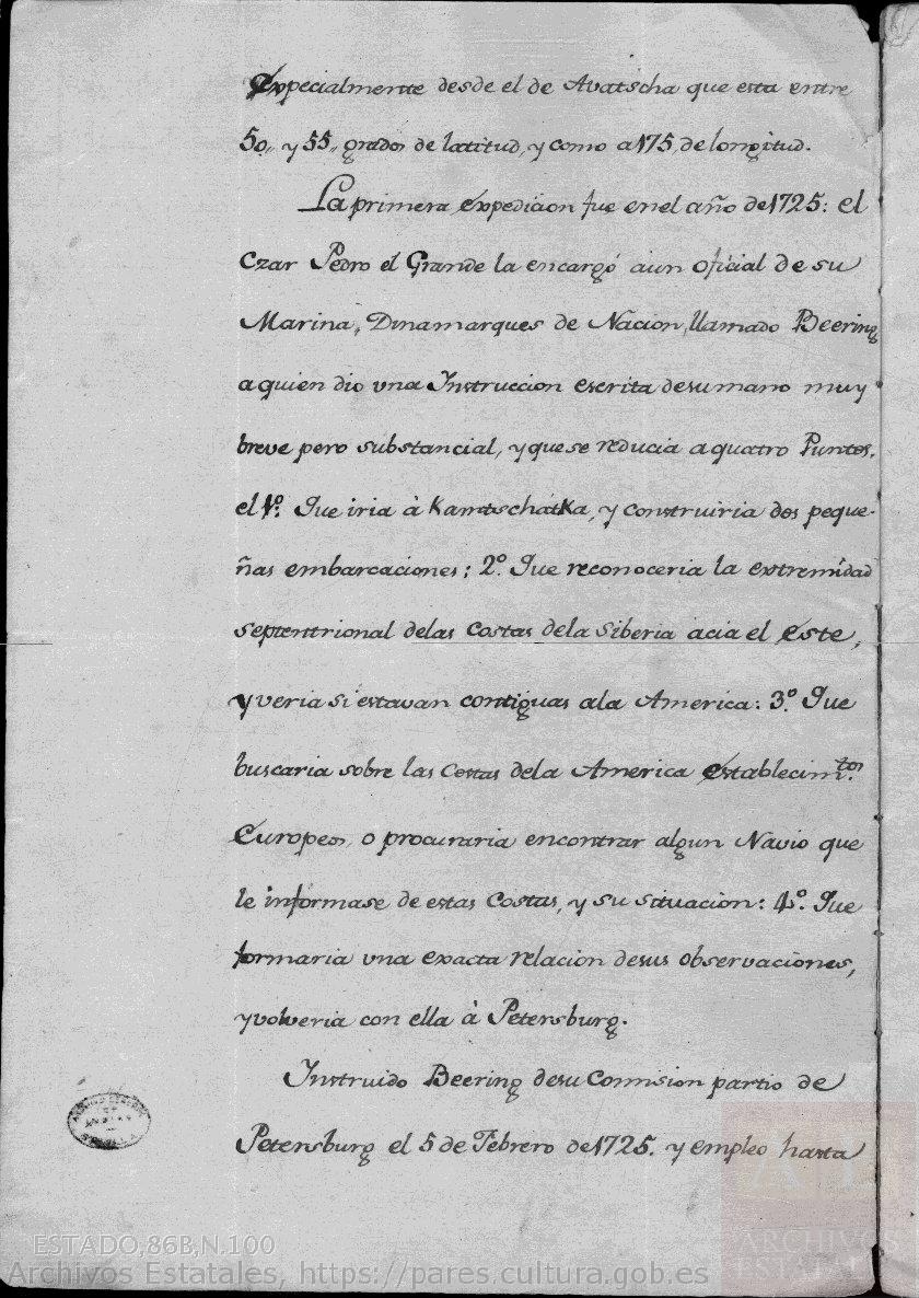 La primera expedición fue en el año de 1725: el Czar Pedro el Grande la encargó a un oficial de su Marina, Dinamarqués de Nación, llamado Beering, a quien dio una Ynstrucción escrita de su mano muy breve pero substancial, y que se reducía a quatro Puntos: el 1º. Que iría a Kamtschatka, y construiría dos pequeñas embarcaciones; 2º. Que reconocería la extremidad septentrional de las Costas de la Siberia acia el Este, y vería si estavan contiguas a la América: 3º. Que buscaría sobre las Costas de la América establecimientos europeos, o procuraría encontrar algún Navío que le informase de estas Costas, y su situación: 4º. Que formaría una exacta relación de sus observaciones, y volvería con ella a Petersburg.