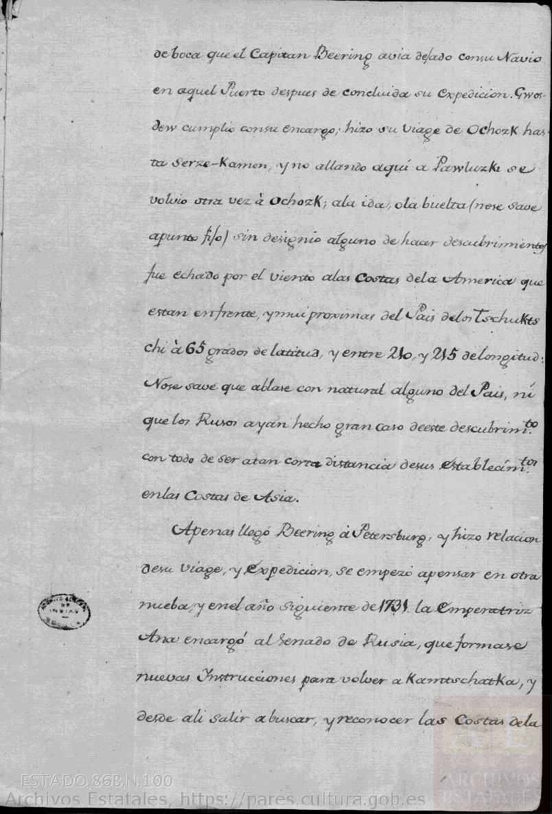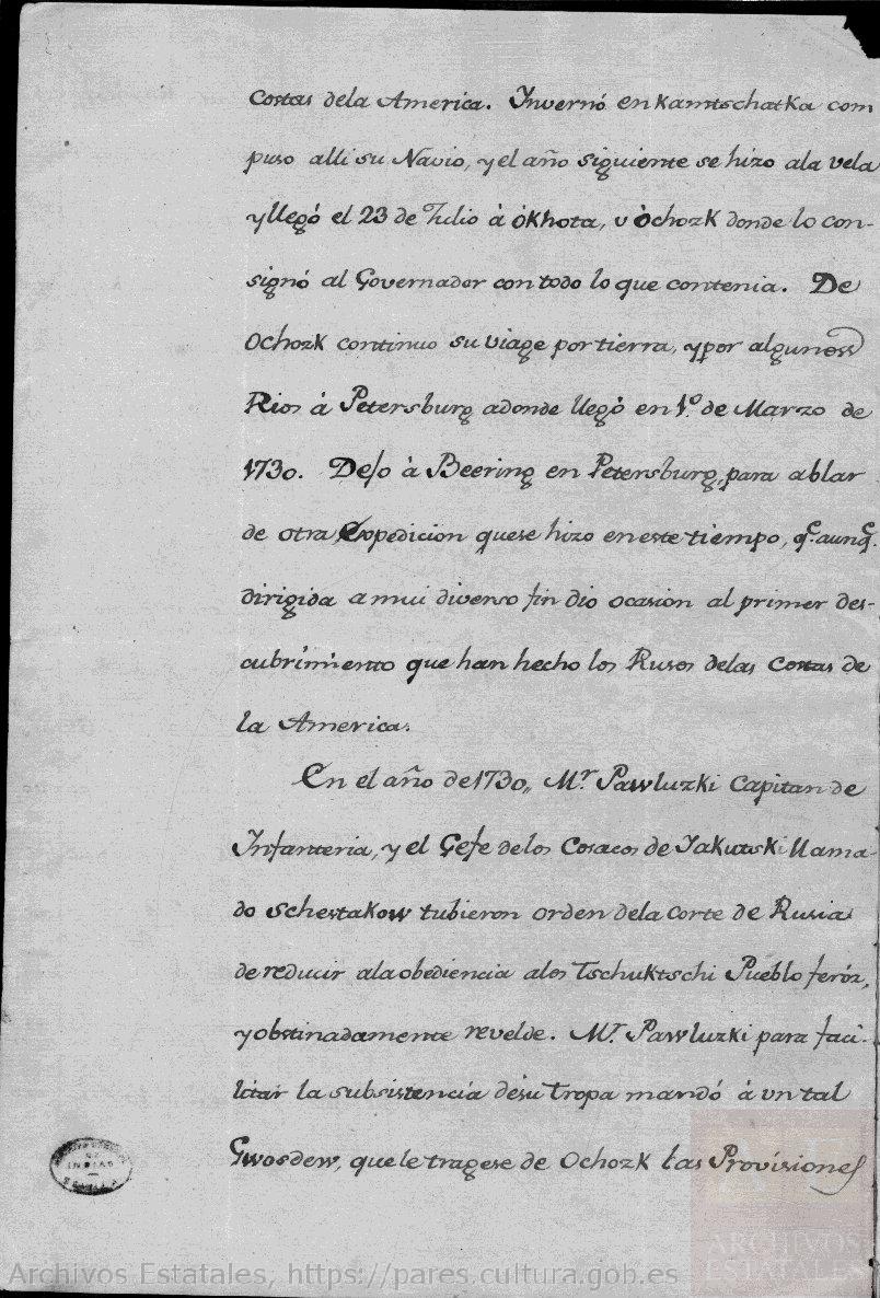 Dejo a Beering en Petersburg, para ablar de otra Expedición que se hizo en este tiempo, que aunque dirigida a mui diverso fin dio ocasión al primer descubrimiento que han hecho los Rusos de las Costas de las Américas. En el año de 1730, Mr. Pawluzki, Capitán de Infantería, y Gefe de los Cosacos de Yakutski llamado Schestakow tubieron orden de la corte de Rusia de reducir a la obediencia a los Tschuktschi Pueblo feroz, y obstinadamente rebelde. Mr. Pawluzki para facilitar la subsistencia de su Tropa mandó a un tal Gwosdew, que le trajese de Ochozk las Provisiones de boca que el Capitan Beering avía dejado con su Navío en aquel Puerto despues de concluida su Expedición. Gwosdew cumplió con su encargo: hizo su viage de Ochozk hasta Serze-Kamen, y no allando allí a Pawluzki se volvió otra vez a Ochozk; a la ida, o la buelta (no se save a punto fijo) sin designio alguno de hacer descubrimientos fue echado por el viento a las Csotas de la América que están enfrente, y mui próximas desl País de los Tschuktschi a 65 grados de latitud, entre 210 y 215 de longitud: No se save que ablase con natural alguno del País, ni que los Rusos ayan hecho gran caso de este descubrimiento con todo de ser a tan corta distancia de sus establecimientos en las Costas de Asia.