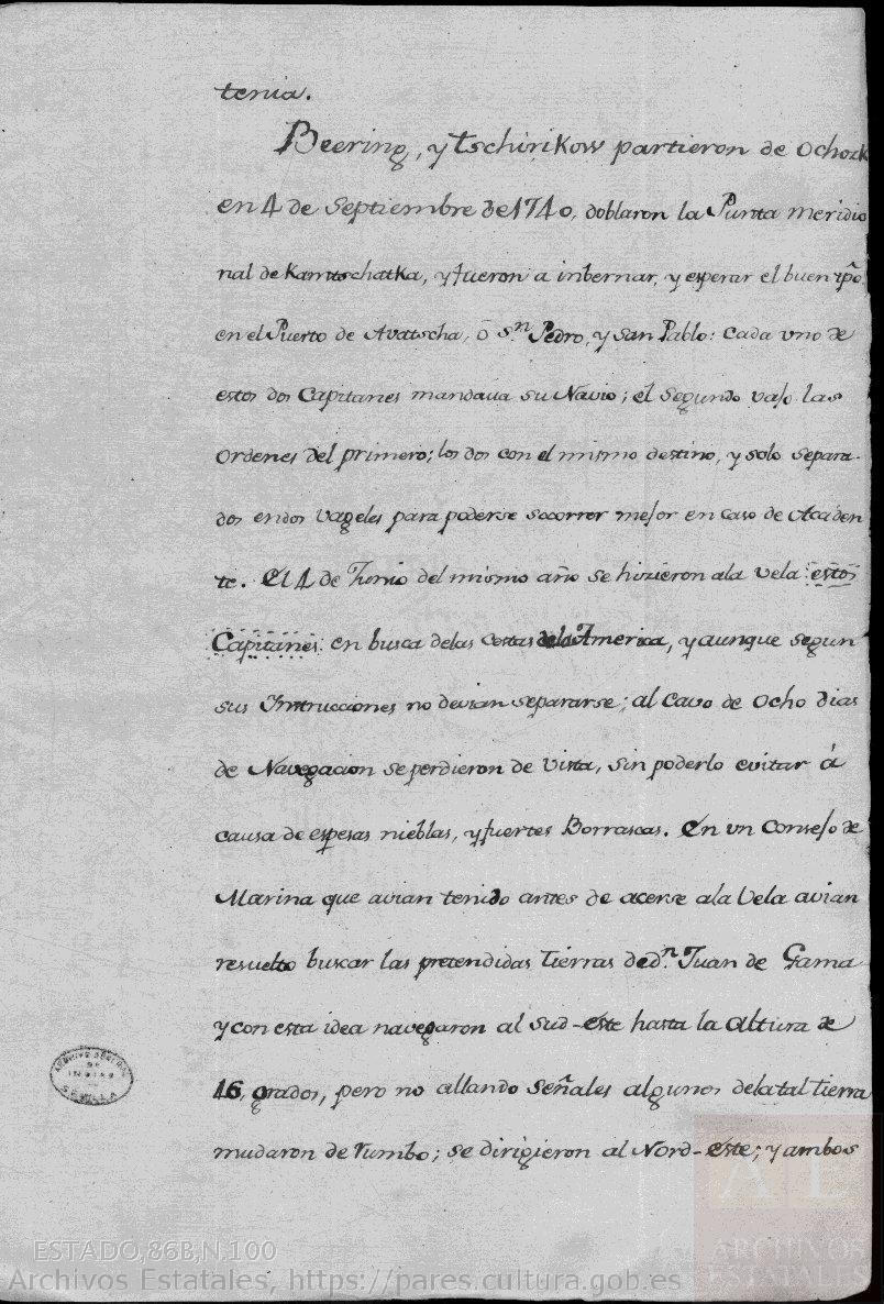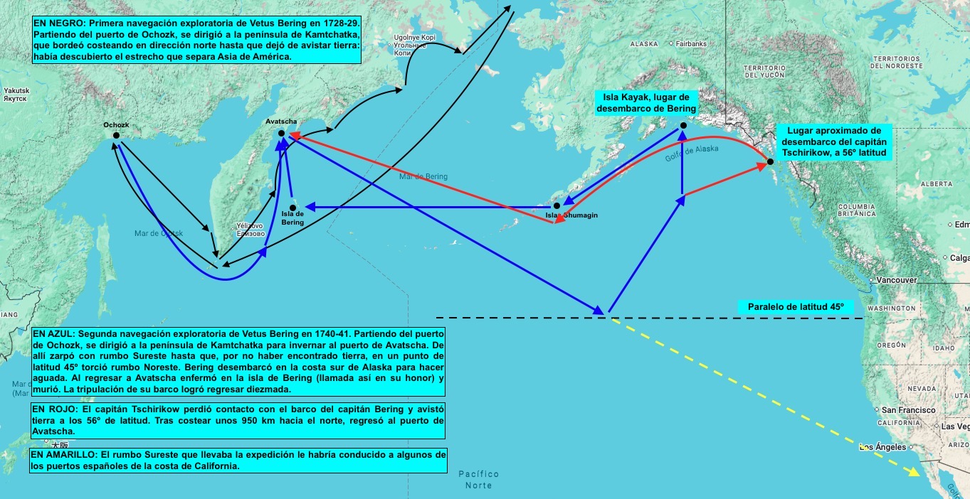 Beering y Tschirikow partieron de Ochozk en 4 de Septiembre de 1740, doblaron la Punta meridional de Kamtschatka, y fueron a inbernar y esperar el buen tiempo en el Puerto de Avatscha, o San Pedro y San Pablo: cada uno de estos dos Capitanes mandava su Navío; el segundo vajo las órdenes del primero; los dos con el mismo destino, y solo separados en dos vageles para poderse socorrer mejor en caso de Accidente. El 4 de Junio del mismo año se hicieron a la vela estos Capitanes en busca de las Costas de la América, y aunque según sus Ynstrucciones no devían separase, al cavo de ocho días de Navegación se perdieron de vista, sin poderlo evitar a causa de espesas nieblas y fuertes Borrascas. En un Consejo de Marina que avían tenido antes de acerse a la Vela avían resuelto buscar las pretendidas Tierras de Don Juan de Gama y con esta idea navegaron al sud-este hasta la altura de 46 grados, pero no allando señales algunos de la tal tierra mudaron de rumbo; se dirigieron al Nord-este; y ambos llegaron a las Costas de la América, pero en diferentes alturas, y sin que el uno tubiese más noticia del otro.