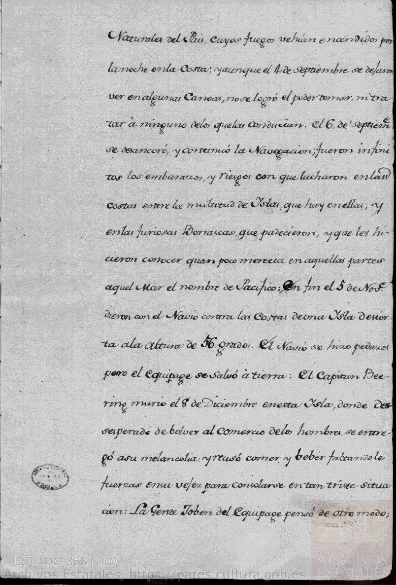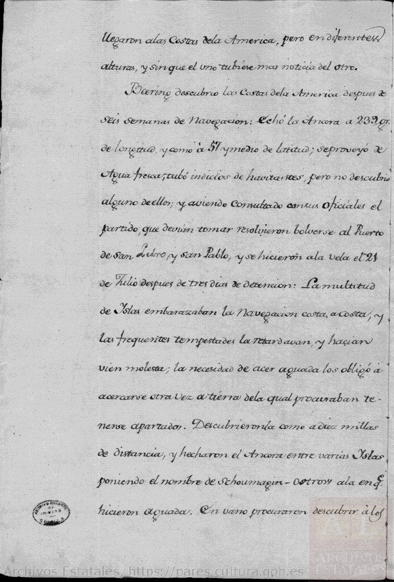 Beering descubrió las Costas de la América después de seis semanas de Navegación: Echó el Áncora a 239 grados de longitud, y como a 57 y medio de latitud; se proveyó de Agua fresca, tubo indicios de havitantes, pero no descubrió alguno de ellos; y aviendo consultado con sus oficiales el partido que devían tomor resolvieron bolverse al Puerto de San Pedro y San Pablo, y se hicieron a la vela el 21 de Julio después de tres días de detención. La multitud de Yslas embarazaban la navegación costa a costa, y las frequentes tempestades la retardavan y hacían vien molesta; la necesidad de acer aguada los obligó a acercarse otra vez a tierra de la quasl procuraban tenerse apartados. Descubrieronla como a diez millas de distancia, y hecharon el Ancora entre varias Yslas poniendo el nombre de Schoumagin-Ostrow a la en que hicieron aguada. En vano procuraron descubrir a los Naturales del País, cuyos fuegos vehían encendidos por noche en la Costa, y auqnue el 4 de Septiembre se dejaron ver en algunas Canoas, no se logró el poder tomar ni tratar a ninguno de los que las conducían. El 6 de Septiembre desancoró y continuó la Navegación; fueron infinitos los embarazos y riesgos con que lucharon en las costas entre la multitud de Yslas que hay en ellas, y en las furiosas Borrascas que padecieron y que les hicieron conocer quan poco merecía en aquellas partes aquel Mar el nombre de Pacífico. En fin, el 5 de Noviembre dieron con el Navío contra las Costas de una Ysla desierta a la altura de 56 grados. El Navío se hizo pedazos pero el equipage se salvó a tierra. El Capitán Beering murió el 8 de diciembre en esta Ysla, donde desesperando de bolver al comercio de los hombres, se entrego a su melancolía y reusó comer y beber, faltándole fuerzas en su vejez para consolarse en tan triste situación: La Gente Joven del Equipaje pensó de otro modo; hicieron Cavañas, juntaron los pedazos del Navío que la Mar hechó a la Costa; fabricaron una buena Barca cubierta con Áncoras y Velas; vivieron de Pescadores y se embarcaron en su Chalupa en 17 de Agosto de 1742. Despues de nuebe días de una feliz Navegación llegaron al Puerto de Avatscha distante 60 millas de Holanda de esta Ysla.