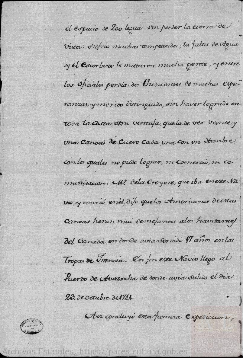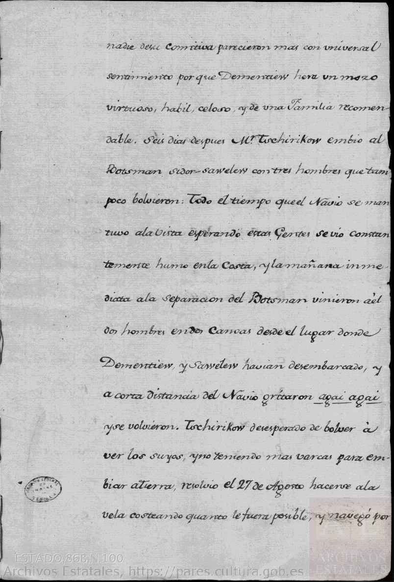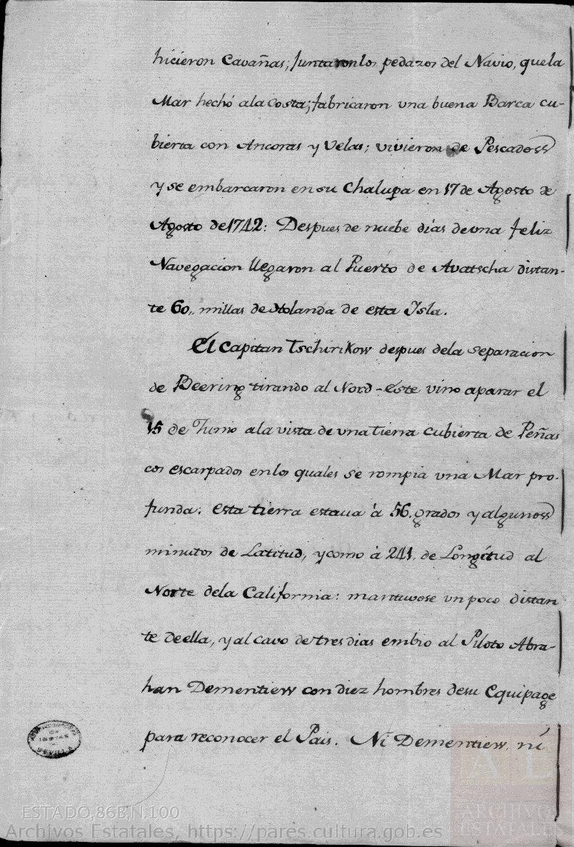 El capitán Tschirikow después de la separación de Beering tirando al Nord-este vino a parar el 15 de Junio a la vista de una Tierra cubierta de Peñas con escarpados en los quales se rompía una Mar profunda: esta tierra estava 56 grados y algunos minutos de longitud, y como a 241 de longitud al Norte de la California: mantuvose un poco distante de ella, y al cavo de tres días embió al Piloto Abraham Dementiew con diez hombres de su Equipage para reconocer el País. Ni dementiew ni nadie de su comitiva parecieron más, con universal sentimiento por que Dementiew hera un mozo virtuoso, hábil, celoso y de una Familia recomendable. Seis días después Mr. Tschirikow embió al Botsman Sidor-Sawelew con tres hombres que tampoco bolvieron: Todo el tiempo que el Navío se mantuvo a la vista esperando estas Gentes se vió constantemente humo en la Costa, y la mañana inmediata a la separación del Bostman vinieron a él dos hombres en dos canoas desde el lugar donde Demetiew y sawelew havían desembarcado, y a corta distancia del Navío gritaron agai agai y se volvieron. Tschirikow desesperado de bolver a ver los suyos, y no teniendo más varcas para embiar a tierra, resolvió el 27 de agosto hacerse a la vela costeando quanto le fuera posible, y navegó por el espacio de 200 leguas sin perder la tierra de vista: sufrió muchas tempestades, la falta de Agua y el Escorbuto le mataron mucha gente, y entre los Oficiales perdió dos Thenientes de muchas esperanzas y mérito distinguido, sin haber logrado en toda la costa otra ventaja que la de ver veinte y una canoas de cuero cada una con un hombre con los quales no pudo lograr ni comercio ni comunicación. Mr. de la Croyere, que iba en este Navío y murió en él, dijo que los Americanos de estas canoas heran mui semejantes a los havitantes del Canadá, en donde avia servido 17 años en las Tropas de Francia. En fin este Navío llegó al Puerto de Avatscha de donde avía salio el día 23 de octubre de 1741.