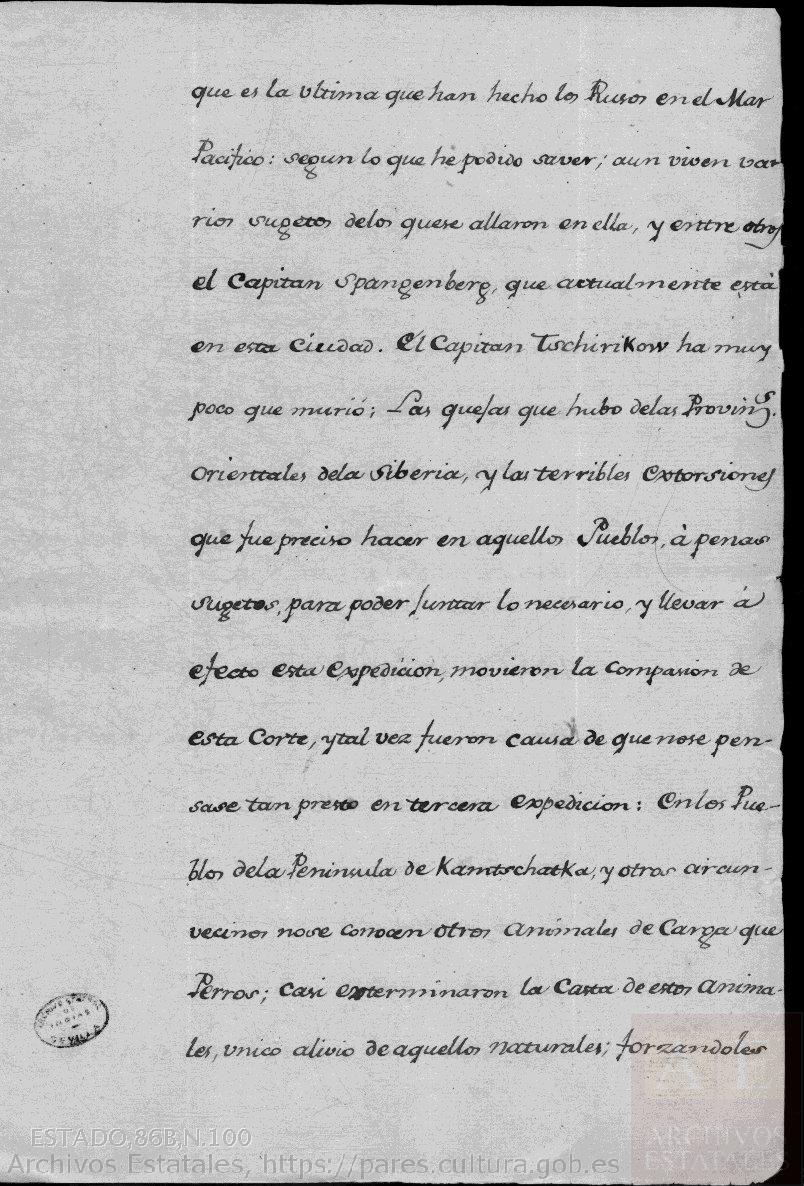 Así concluyó esta famosa expedición, que es la última que han hecho los Rusos en el Mar Pacífico: según loque he podido saber, aún viven varios sugetos de los que se allaron en ella, y entre otros el Capitán Spangenberg, que actualmente está en esta ciudad. El Capitán Tschirikow ha mui poco que murió: Las quejas que hubo de las Provincias Orientales de la Siberia y las terribles extorsiones que fue preciso hacer en aquellos Pueblos, apenas sugetos para poder juntar lo necesario, y llevar a efecto esta expedición, movieron la Compasión de esta Corte, y tal vez fueron la causa de que no se pensase tan presto entercera expedición: en los Pueblos de la Península de Kamtschatka y otros circunvecinos no se conocen otros animales d carga que Perros; casi exterminaron la casta de estos animales, único alivio de aquellos naturales, forzándoles a llevar mayores cargs de las que permitían sus fuerzas para la Provisión de los Navíos y conducción de los equipages: con todo no se ha perdido enteramente de vista este objeto; me consta que se tiene muy presente, y no sería mui extraño que hecha la Paz, se pensase en tercera expedición.