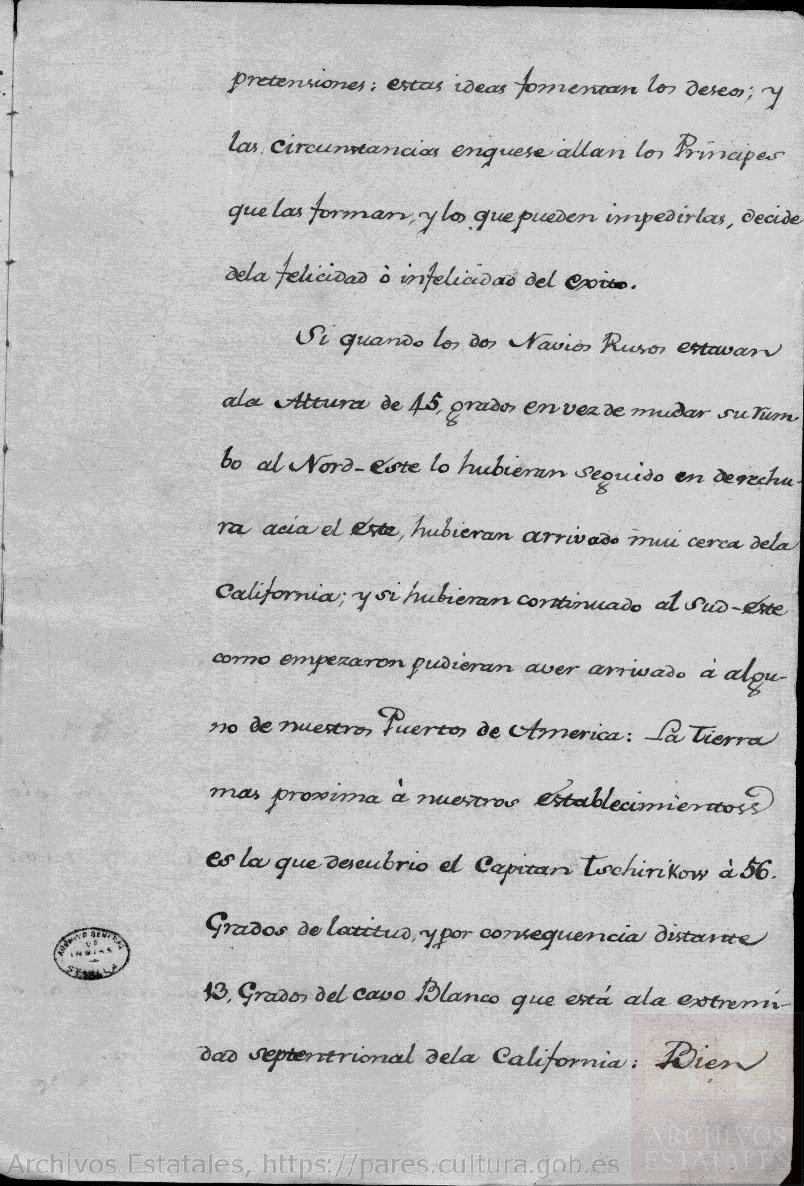 Si quando los dos Navíos Rusos estavan a la altura de 45 grados en vez de mudar su rumbo al Nord-este lo huberan seguido en derechura hacia el Este, hubiesen arribado mui cerca de la California; y si hubieran continuado al Sud-este como empezaron pudieron aver arrivado a alguno de nuestros Puertos de América: La Tierra más próxima a nuestros establecimientos es la que descubrió el Capitán Tschirikov a 56 Grados de latitud y, por consequencia, distante 13 grados del cavo Blanco, que está a la extremidad septentrional de la California. Bien pudiera alguno de los Rusos que quedaron en esta costa aver llegado por Tierra a alguna de las Misiones Españolas; pero es natural que perecieran antes a manos de los Yndios. Es mui natural que jamás de consiga la noticia que aquí tanto se desea de paradero de estos infelices rusos.