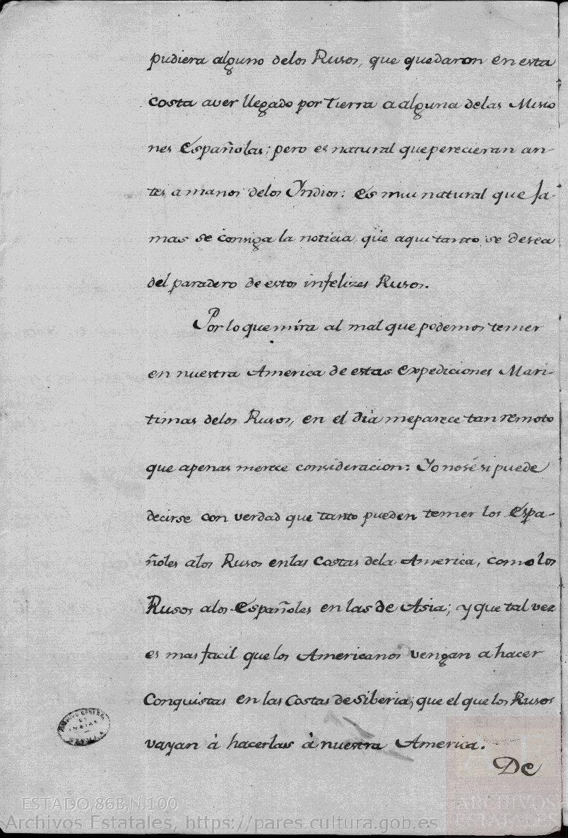 Por lo que mira al mal que podemos temer en nuestrs América de estas expediciones Marítimas de los Rusos, en el día me parece tan remoto que apenas merece consideración: Yo no se si puede decirse con verdad qué tanto pueden temer los Españoles a los Rusos en las de Asia, y que tal vez es más fácil que los Americanos vengan a hacer Conquistas en las costas de Siberia, que el que los Rusos vayan a hacerlas a nuestra América.