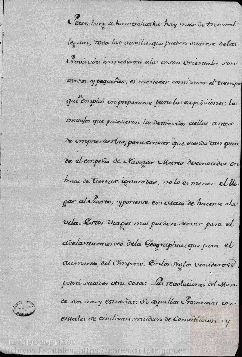 De Petersburgo a Kamtschatka hay más de tres mil leguas; todos los auxilios que pueden sacarse de las Provincias inmediatas a las costas Orientales con tardos y pequeños; es menester considerar el tiempo que se empleó en prepararse para las expediciones; los travajos que padecieron los destinados a ellas antes de emprenderlas, para conocer que siendo tan grande el empeño de Navegar Mares desconocidos en busca de Tierra ignoradas, no lo es menor el llegar al Puerto y ponerse en estado de hacerse a la vela. Estos viages mas pueden servir para el adelantamiento de la Geographia que para el aumento del Imperio. En los siglos venideros podrá suceder otra cosa: Las revoluciones del Mundo son muy estrañas: Si aquellas Provincias orientales se civilizan, mudan de Constitución y aprovechan de su situación, podrán hacer grandes cosas que oy ni devemos temer, ni imaginar.