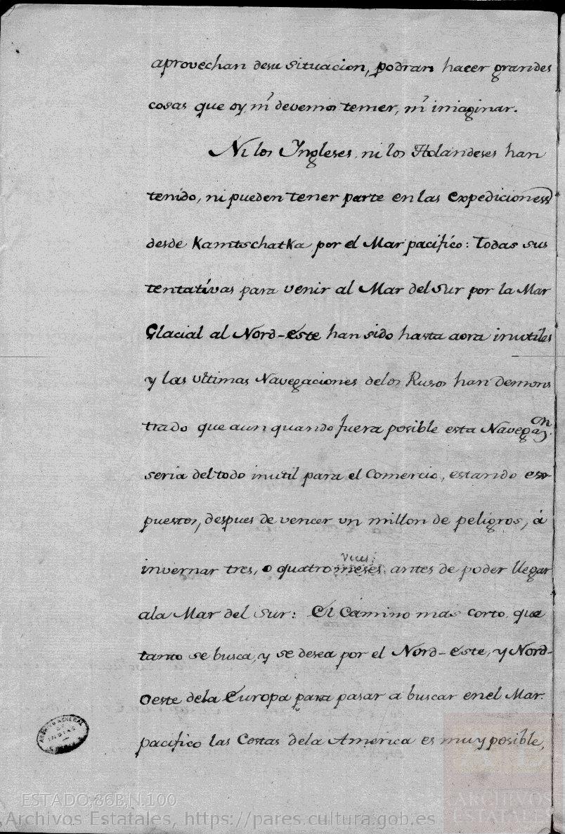 Ni los Yngleses ni los Holandeses han tenido, ni pueden tener parte en las expediciones desde Kamtchatka por el Mar pacífico: todas sus tentativas para venir al Mar del Sur por la Mar Glacial al Nord-este han sido hasta aora inútiles, y las últimas navegaciones de los Rusos han demostrado que aun quando fuera posible esta navegación, sería del todo inútil para el Comercio, estando expuestos, después de vencer un millón de peligros, a invernar tres o quatro meses antes de poder llegar a la Mar del Sur: El camino más corto que tanto se busca y se desea por el Nord-este y Nord-oeste de la Europa para pasar a buscar en el Mar pacífico las costas de la América es muy posible que no exista sino en los Glovos Geográphicos o en las cavezas de algunos Geographos.