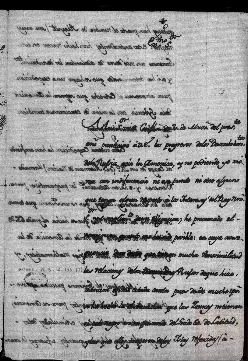 Mui Sr. mio: Con fecha 30 de Marzo del presente año participe a V.E. los progresos de los Descubrimientos de la Rusia acia la América, y no pudiendo yo mirar con indiferencia ni ese punto ni otro alguno que tenga algún respecto a los Intereses del Rey Ntro. Sr. y cumpliendo de mi obligación, he procurado el averiguar quenato me ha sido posible: en cuya consequencia devo decir que tienen mucha verosimilitud las relaciones de los Mercaderes Rusos de que hice mención en mi citada carta, pues desde mucho tiempo se ha hecho la observación que las Zorras no tienen el pelo negro en su xxx del Grado 60 de Latitud, y las que ellos dijeron de las Islas referidas (a quienes han puesto el nombre de Aleyut) son muy negras: estos antecedentes han hecho nacer en este Govierno un vivo deseo de adelantar los descubrimientos y así ha determinado que se haga una expedición para atravesar el Estrecho que separa la America de a Syberia con la mira de cercirarse también de los dichos descubrimientos.