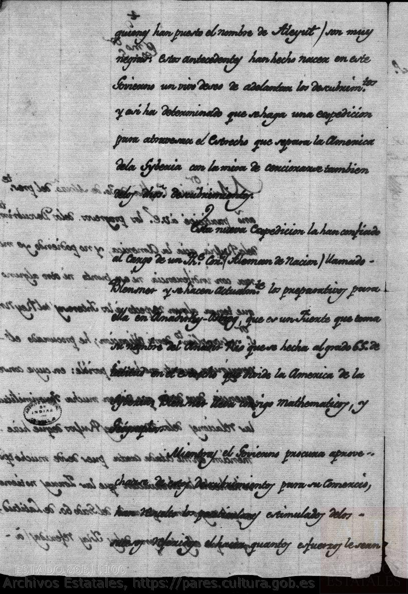 Esta nueva expedición la han confiado al cargo de un Theniente Coronel (Alemán de nación) llamado Blensner y se hacen actualmente los preparativos para ella en Anadrosky-Ostrog, que es un Fuerte que toma su nombre del ancho Río que se hecha al grado 65 de latitud en el estrecho que divide la América de ña Syberia; también lleva consigo mathemáticos, y Geographos.