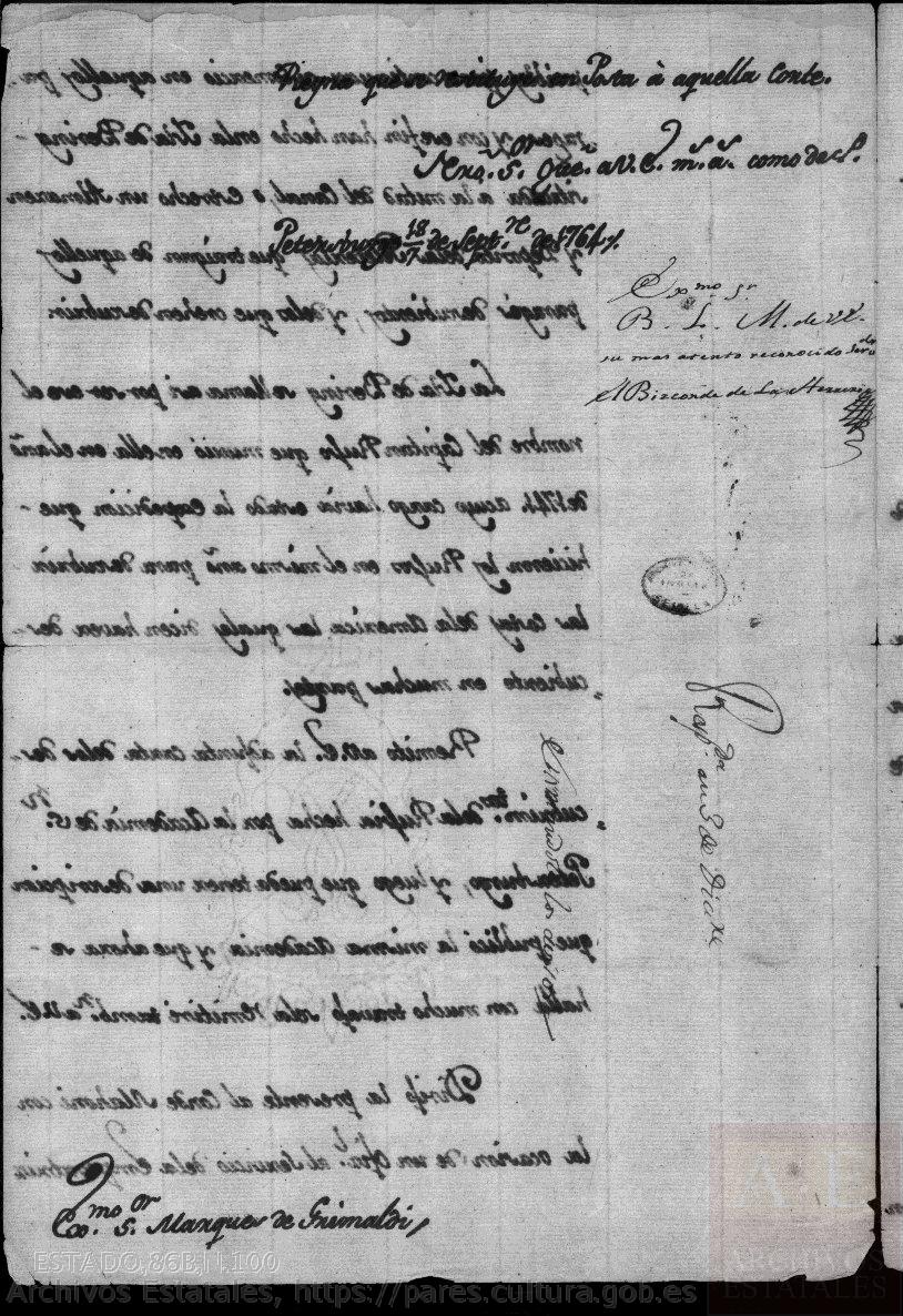 Informe del vizconde de Herrería, don Álvaro de Navia Osorio y Bellet, ministro plenipotenciario español en San Petersburgo, dirigido al Exmo. Sr. marqués de Grimaldi, ministro de Estado del reino de España, sobre los descubrimientos realizados por comerciantes rusos en aguas del Pacífico norte desde la península de Kamtchatka, el descubrimiento de las islas Aleutianas y los preparativos de una nueva expedición al mando de un teniente coronel de nombre Brensner, fechado el 18 de septiembre de 1764.