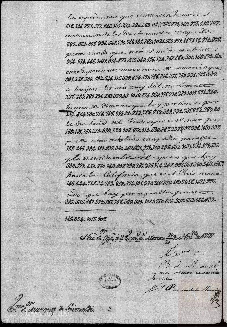 Informe del vizconde de Herrería, don Álvaro de Navia Osorio y Bellet, ministro plenipotenciario español en San Petersburgo, dirigido al Exmo. Sr. marqués de Grimaldi, ministro de Estado del reino de España, dando cuenta de que los rusos continúan sus proyectos de llegar a América, fechado el 31 (sic) de noviembre de 1767.