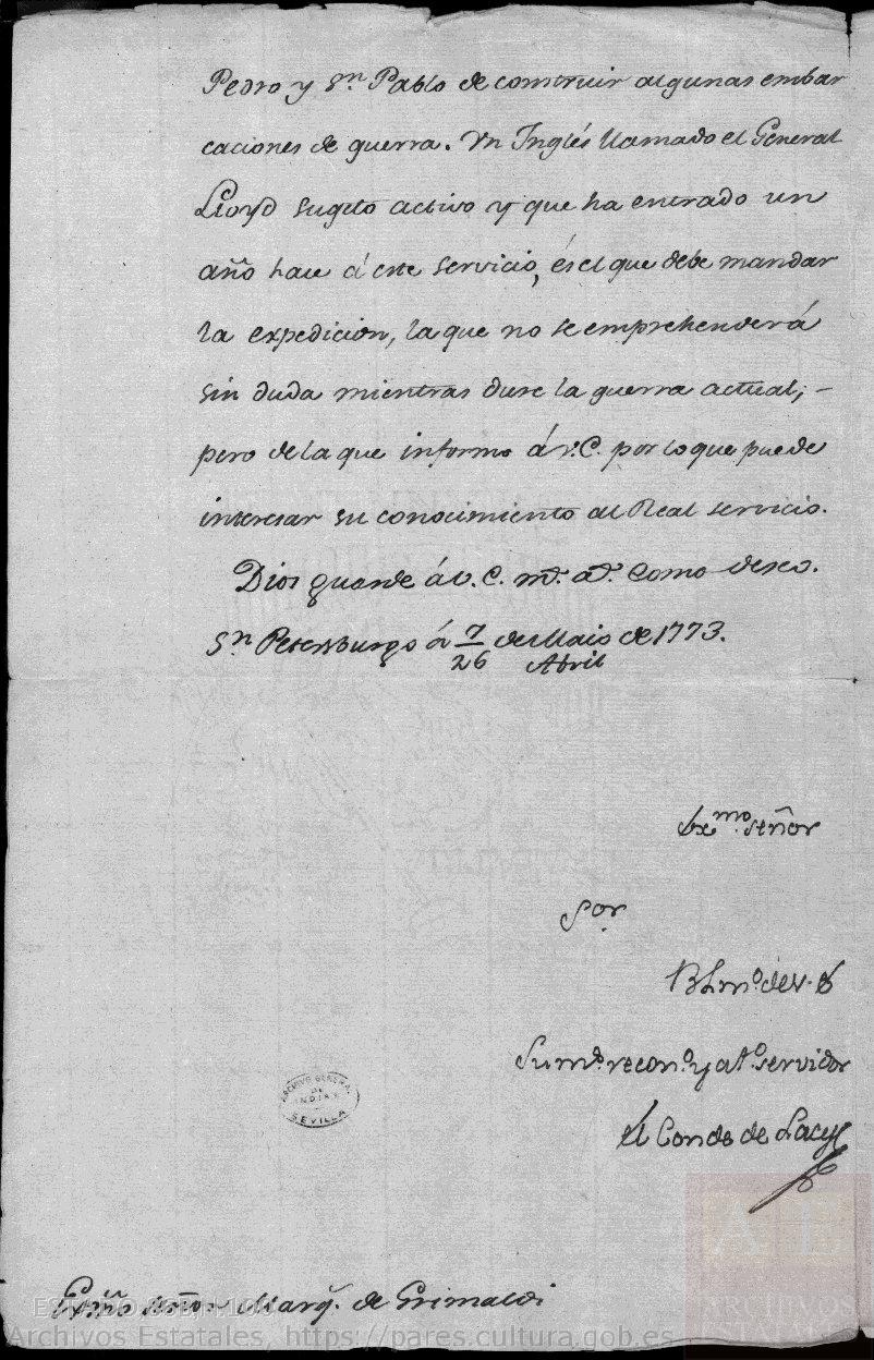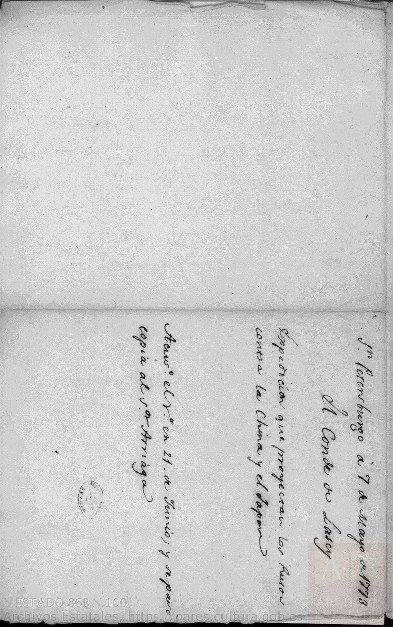 Carta nº 64 de don Francisco Antonio de Lacy, conde de Lacy, al marqués de Grimaldi, informando de los preparativos rusos para invadir China y Japón, fechada el 7 de mayo de 1773.