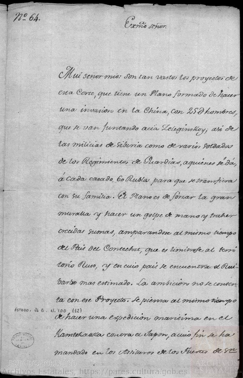 Mui señor mío: son tan vastos los proyectos de esta Corte, que tiene un Plano formado de hacer una invasión en la China, con 25.000 hombres, que se van juntando acia Zeleginskoy; así de las milicias de Siberia como de varios soldados de los Regimientos de Guardias, a quienes se da a cada casado 60 Rublos para que se transfiera con su familia. El Plano es de forzar la gran muralla y hacer un golpe de mano y traher crecidas sumas, amparándose al mismo tiempo del País de Contechzi, que es limítrofe al territorio Ruso, y en cuio país se encuentra el Ruibarbo más estimado.