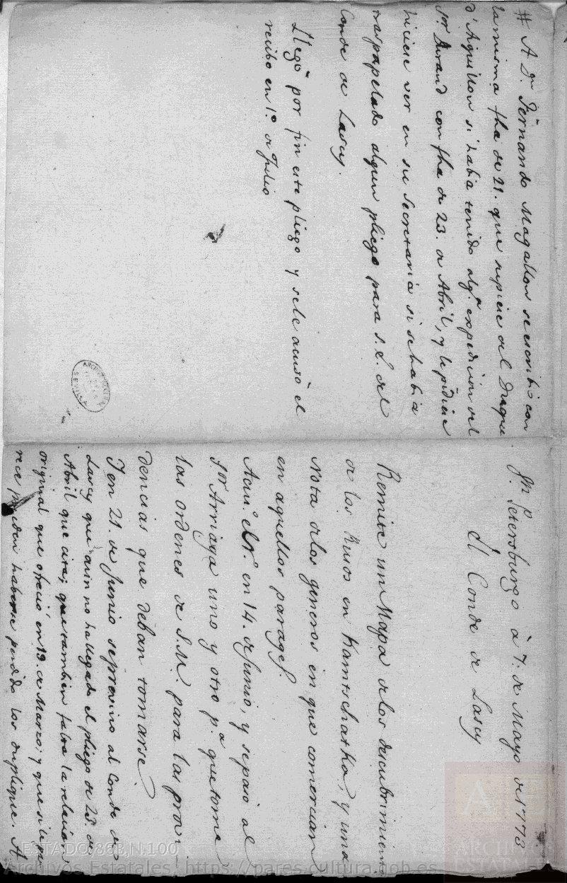 Y en 21 de junio se previno al Conde de Lascy (sic) que aún no ha llegado el pliego de 23 de Abril, que cita; que también falta la relación original que ofreció en 19 de Marzo, y que si le parece pueden haberse perdido los duplique. A Don Fernando Magallón se escribió con la misma fecha de 21 que supiese al Duque d'Aguillon si había tenido alguna expedición del Sr. Durand con fecha 23 de abril, y le pidiera hiciese ver en su Secretaría si se había traspapelado algún pliego para S.E. del Conde de Lascy (sic).