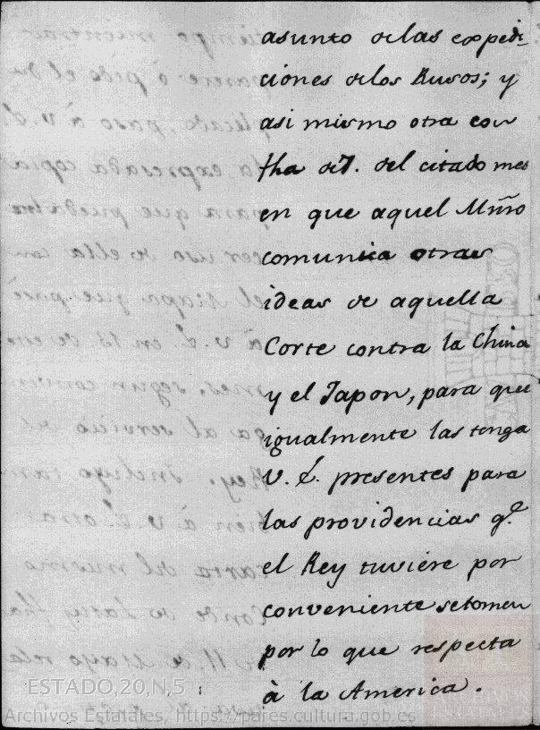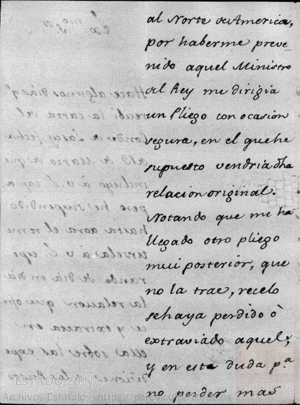 Notando que me ha llegado otro pleigo mui posterior, que no la trae, recelo se haya perdido o extraviado aquel, y en esta duda para no perder mas tiempo mientras parece o pido el duplicado, paso a V.E. la expresada copia para que pueda hacer eso de ella con el Mapa que pasé a V.E. en 13 de este mes, segun convenga al servicio del Rey. Incluyo tambien a V.E. otra carta del mismo Conde de Lascy fecha de 11 de mayo relativa al proprio asunto de las expediciones de los Rusos; y asi mismo otra con fecha 7 del citado mes en que aquel Ministro comunica otras ideas de aquella Corte contra la China y el Japón, para que igualmente las tenga V.E. presentes para las providencias que el Rey tuviere por conveniencia se tomen por lo que respecta a la America.