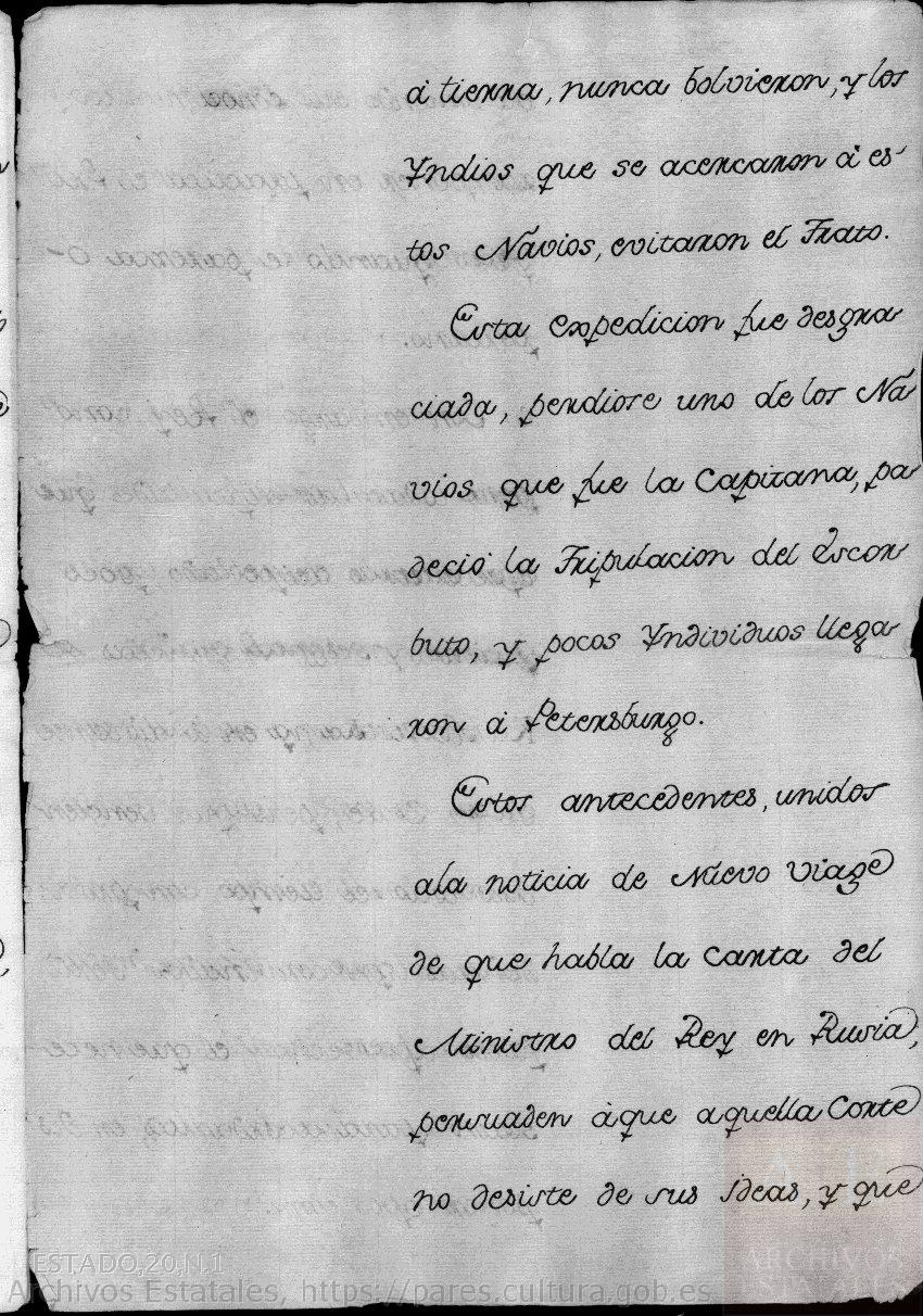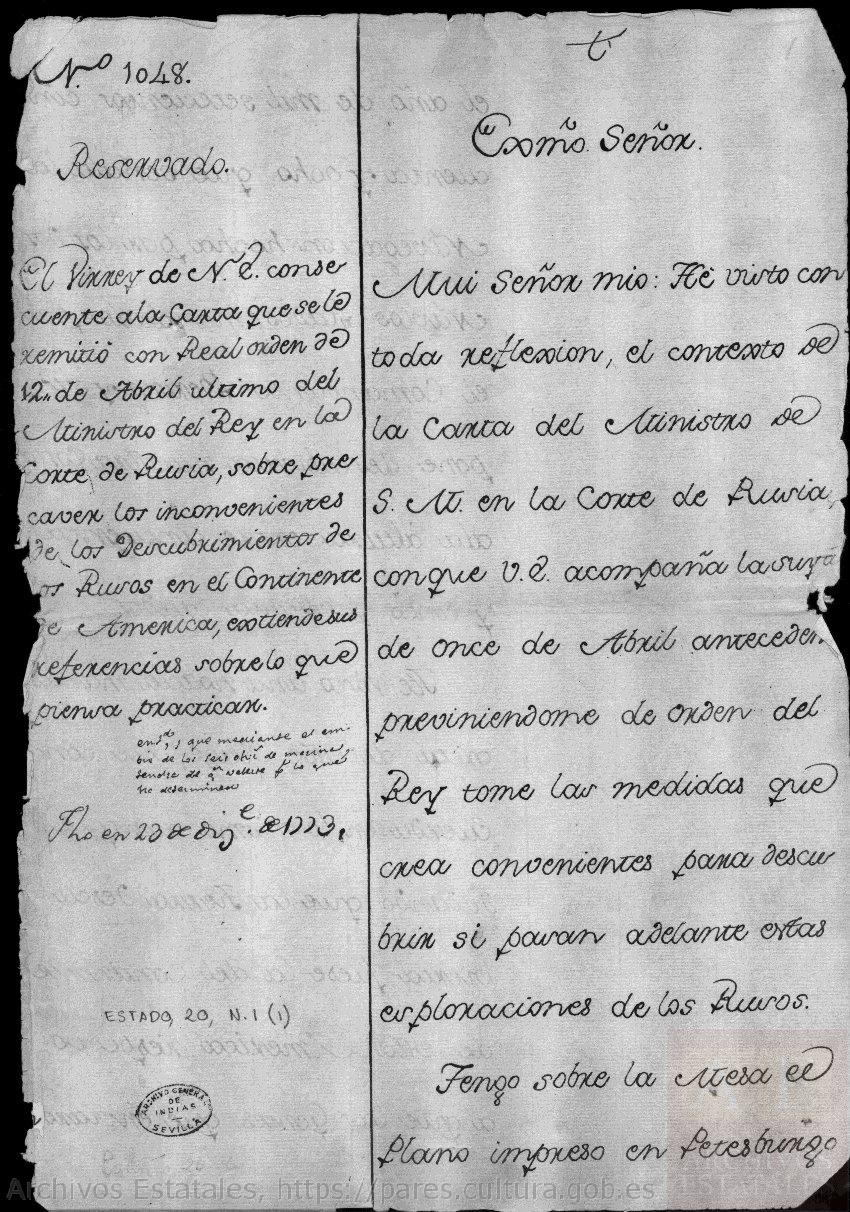 Mui Señor mio: He visto con toda reflexión el contexto de la Carta del Ministro de S.M. en la Corte de Rusia, con que V.E. acompaña la suya de once de abril antecedente previniéndome de orden del Rey tome las medidas convenientes para descubrir si pasan adelante estas exploraciones de los Rusos.