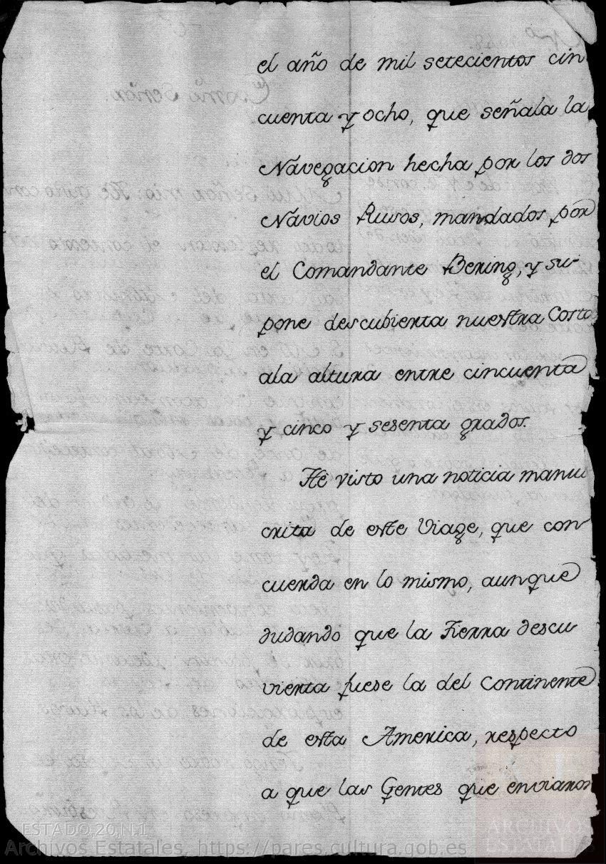 Tengo sobre la mesa el plano impreso en Petersburgo el año de mil setecientos cincuenta y ocho, que señala la Navegación hecha por los dos Navíos Rusos, mandados por el Comandante Bering, y supone descubierta nuestra costa a la altura entre cincuenta y cinco y sesenta grados.