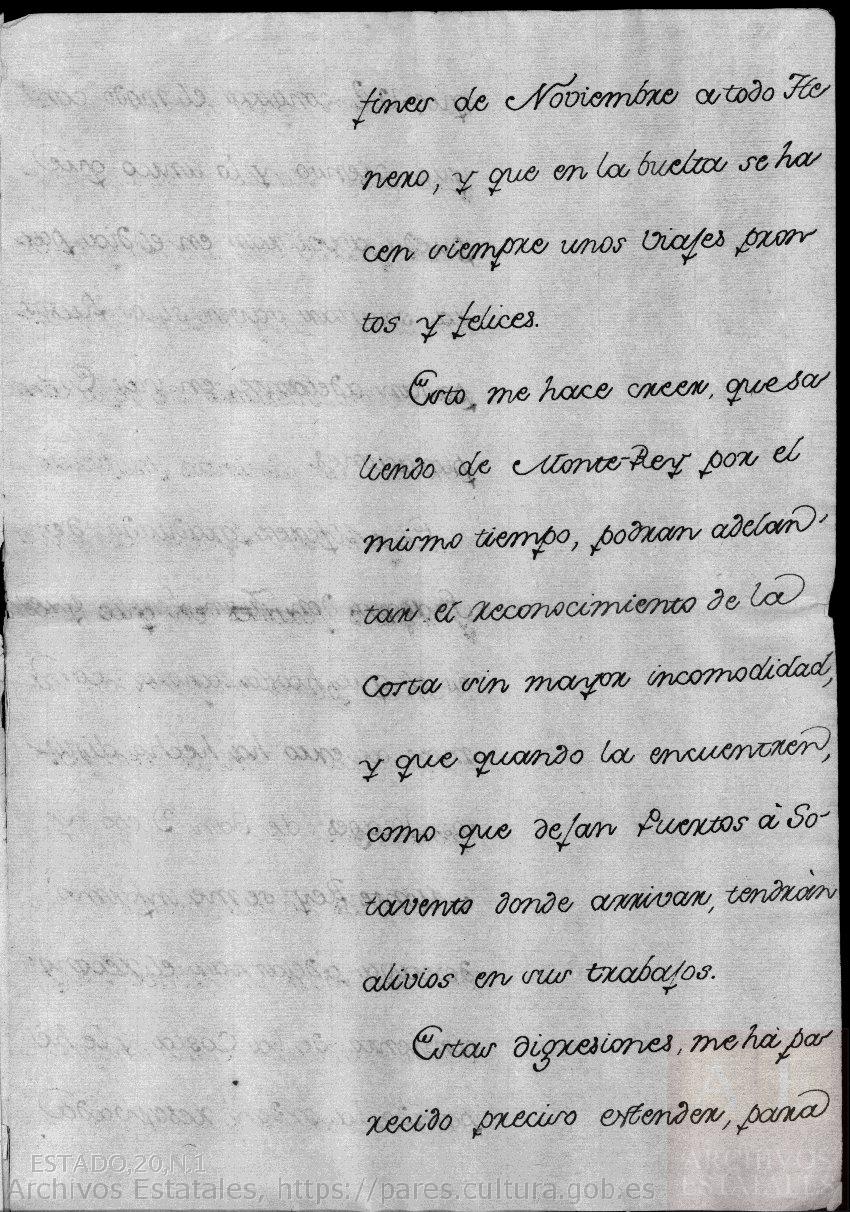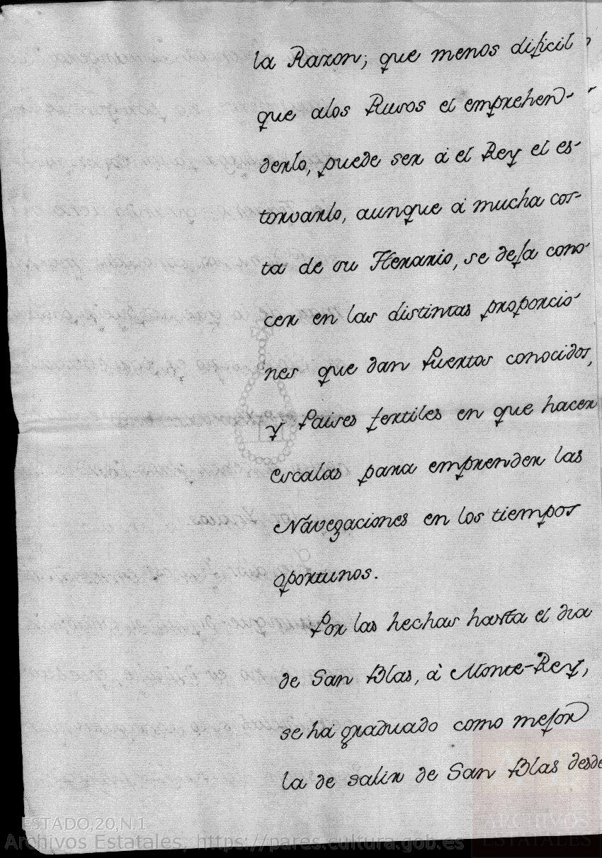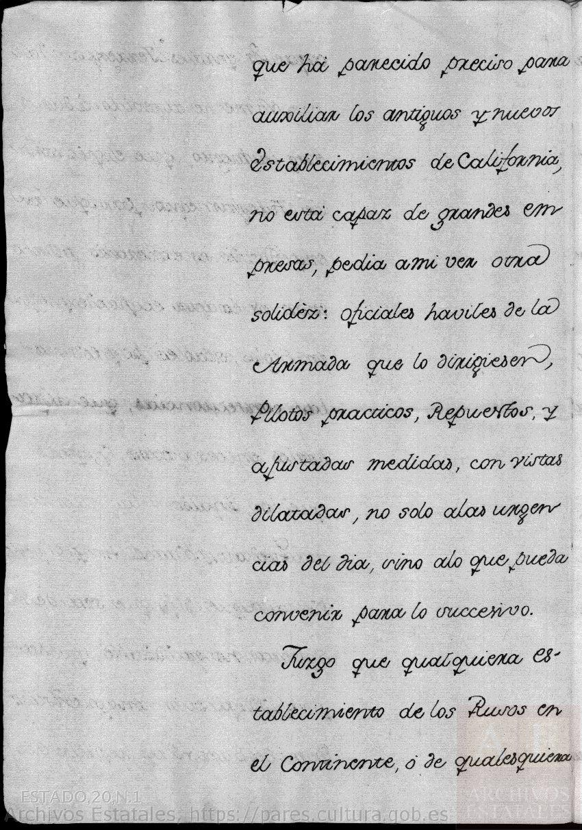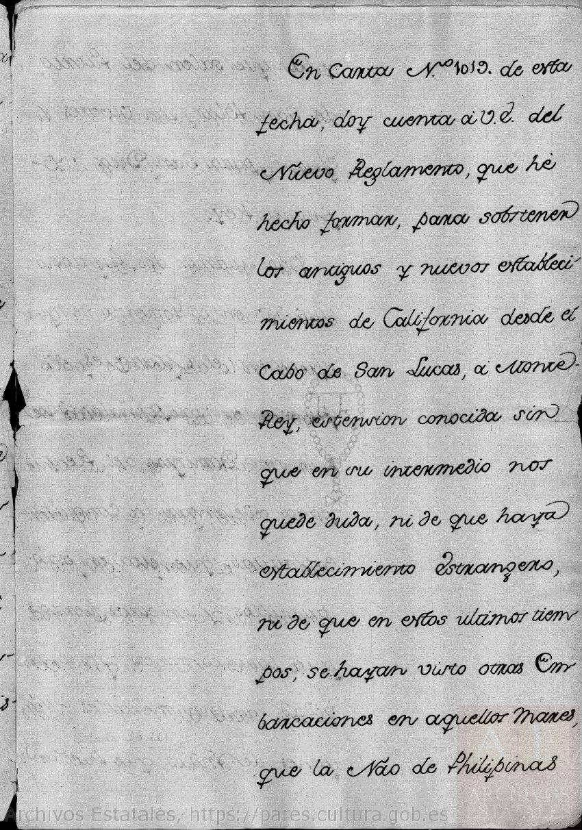 En carta Nº 1018 de esta fecha, doy cuenta a V.E. del Nuevo Reglamento, que he hecho formar, para sobstener los antiguos y nuevos establecimientos de California desde el Cabo de San Lucas, a Monte Rey, extensión conocida sin que su intermedio nos quede duda, ni de que haya establecimientos extranjeros, ni de que en estos últimos tiempos se hayan visto otras Embarcaciones en aquellos mares, que la Nao de Philipinas y las que salen del puerto de San Blas, con víveres y efectos para san Diego y Monte-Rey.