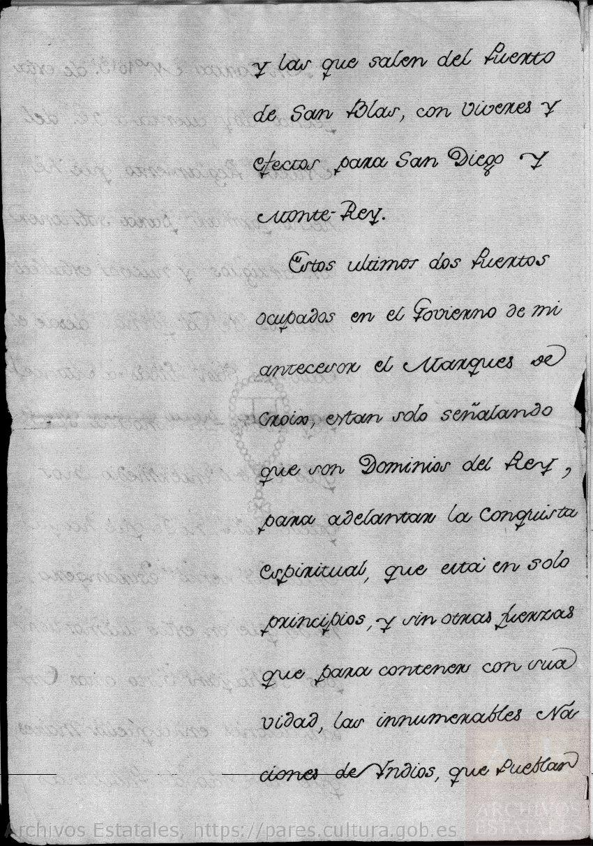 Estos últimos dos puertos ocupados en el Gobierno de mi antecesor el Marqués de Croix, están solo señalando que son Dominios del Rey, para adelantar la conquista espiritual, que está en solo principios, y sin otras fuerzas que para contener con sus vidas, las innumerables Naciones de Yndios, que pueblan aquellos fértiles terrenos.