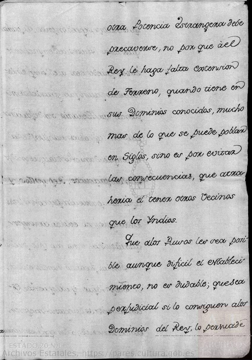 Juzgo que qualquiera establecimiento de los Rusos en el Continente, o de qualesquiera otra Potencia estrangera debe precaverse, no por que a el Rey le haga falta extensión de terreno, quando tiene en sus Dominios conocidos, mucho más de lo que se puede poblar en siglos, sino es por evitar las consecuencias, que atrahería el tener otros vecinos que los Yndios.