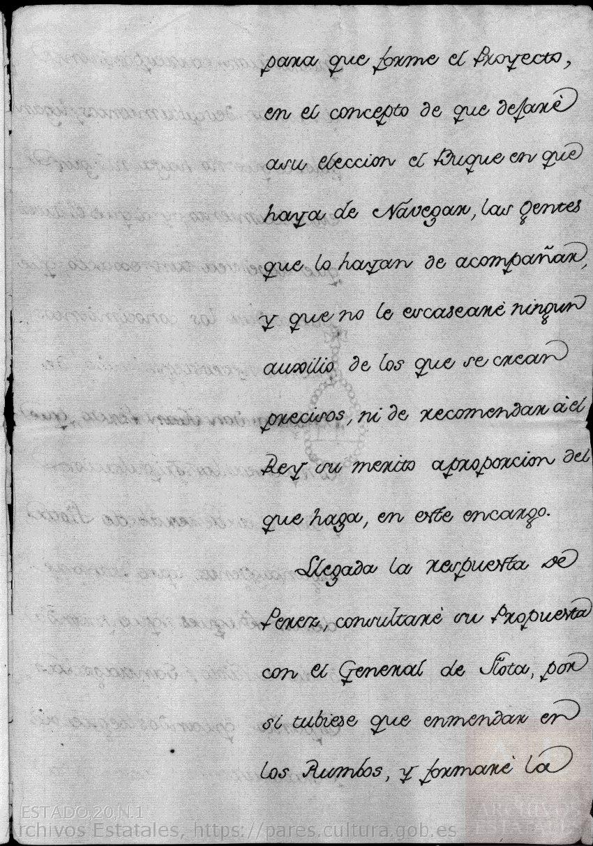 Llegada la respuesta de Pérez, consultaré su Propuesta con el General de Flota, por si tubiese que enmendar en los Rumbos, y formaré la Instrucción correspondiente a nuevos descubrimientos, ligándolo a que no haya ningún establecimiento, y a que el diario que lleve sean tan exacto, que pueda dar los conocimientos que se necesiten.