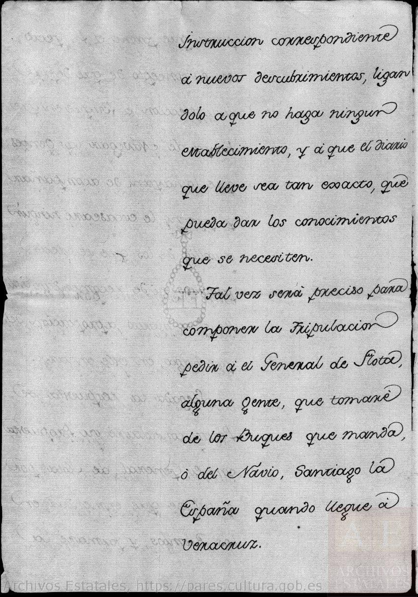 Tal vez será preciso para componer la Tripulación pedir a el General de Flota alguna gente, que tomaré de los Buques que manda, o del Navío, Santiago la España quando llegue a Veracruz.