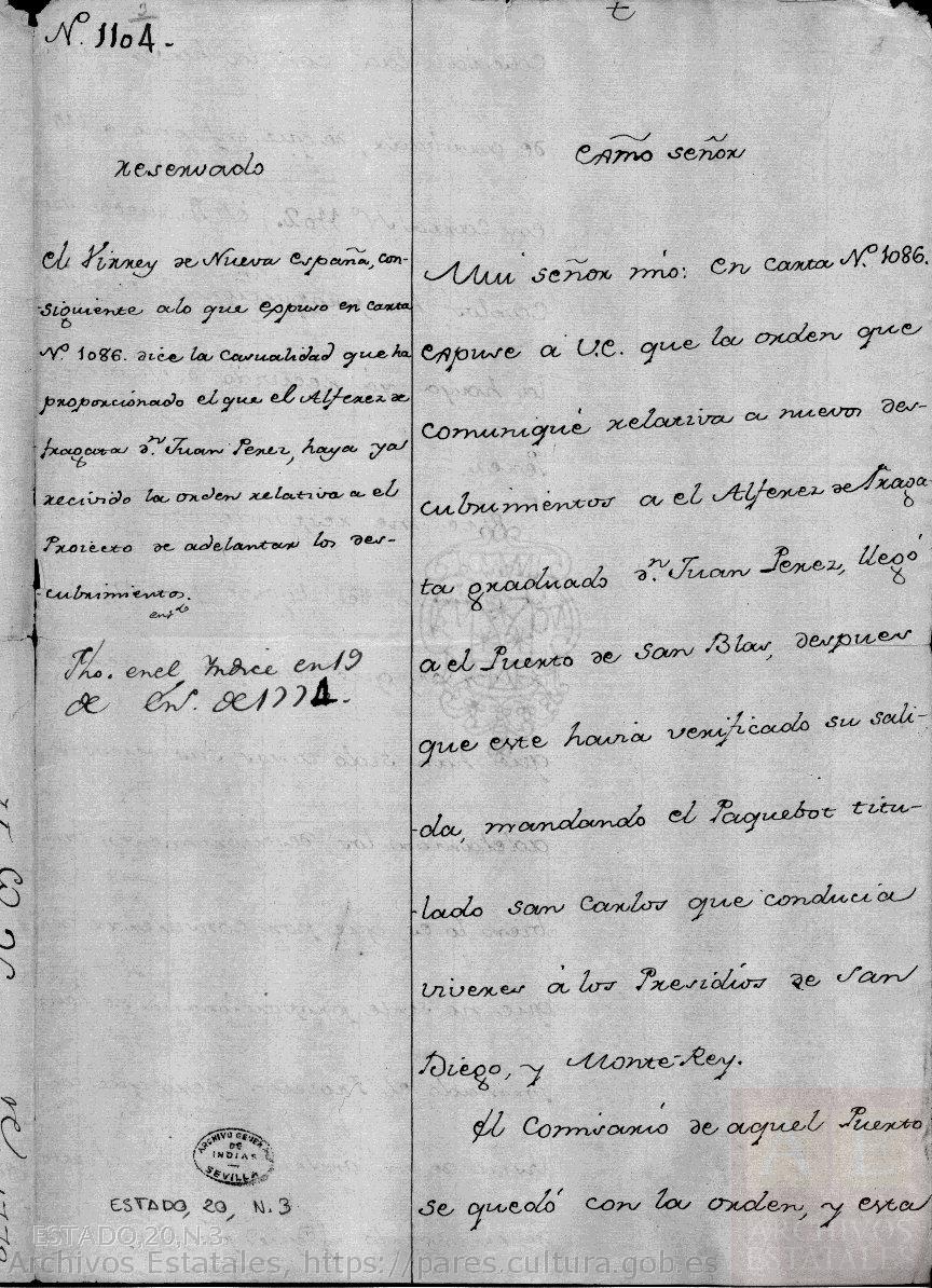 Mui Señor mio: en carta nº 1086 expuse a V.E. que la orden que comuniqué relativa a nuevos descubrimientos a el Alférez de Fragata graduado don Juan Pérez llegó a el Puerto de San Blas, despues que este havia verificado su salida, mandando el Paquebot tirulado San Carlos que conducía víveres a los Presidios de San Diego y Monte-Rey.