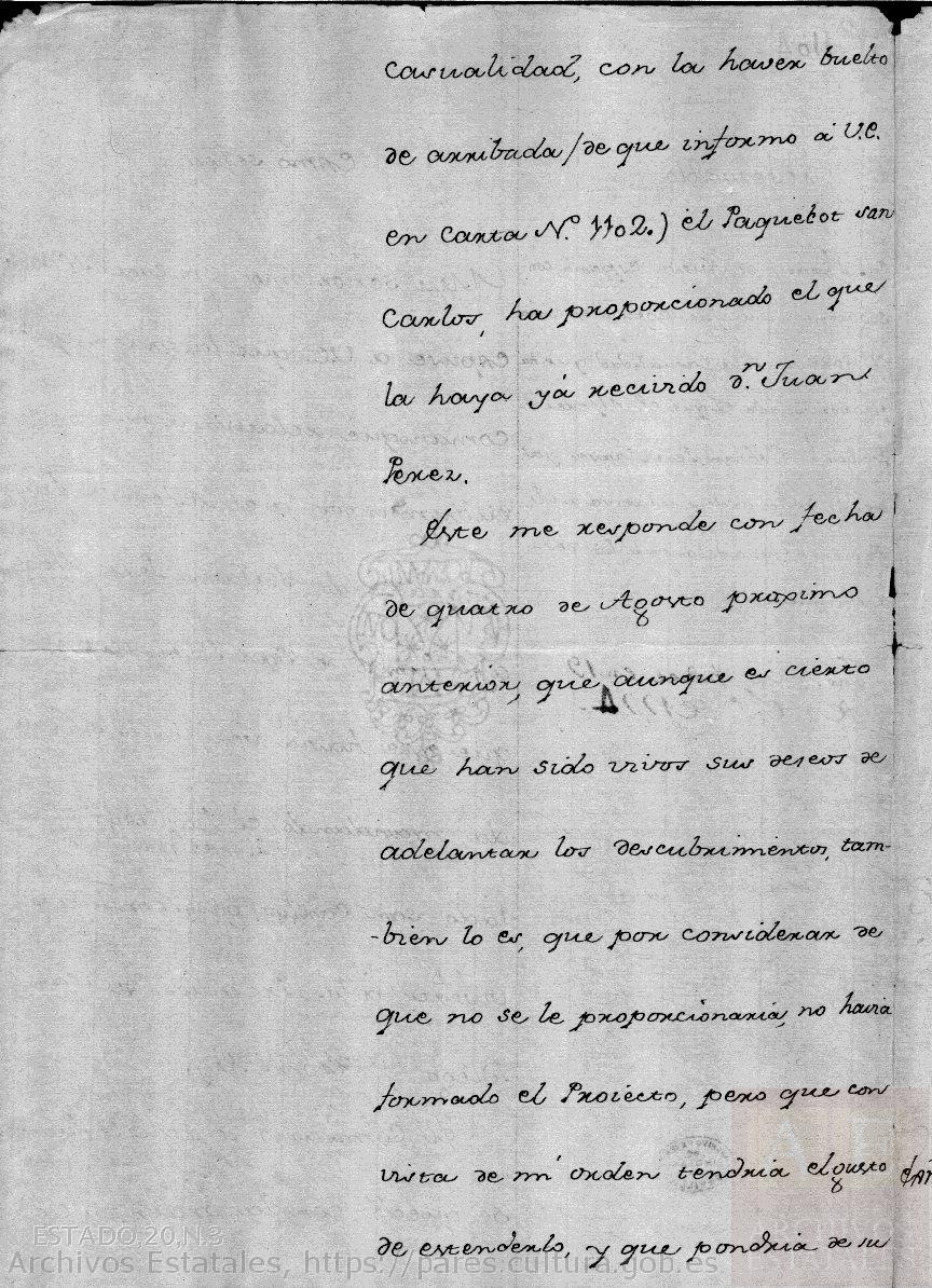 El Comisario de aquel Puerto se quedó con la orden, y esta casualidad, con la haver buelto de arribada (de que informo a V.E. en carta nº 1102) el Paquebot San Carlos ha proporcionado el que la haya recivido don Juan Pérez.
