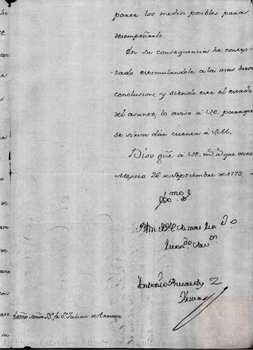 Carta nº 1086 del virrey de Nueva España, don Antonio Bucareli y Ursúa, a don Julián de Arriaga, secretario de Estado de Marina, en la que, consiguiente a lo que expuso en carta nº 1086, dice la casualidad que ha proporcionado el que el Alférez de Fragata don Juan Pérez haya ya recibido la orden relativa a el proyecto de adelantar los descubrimientos, de 26 de septiembre de 1773.