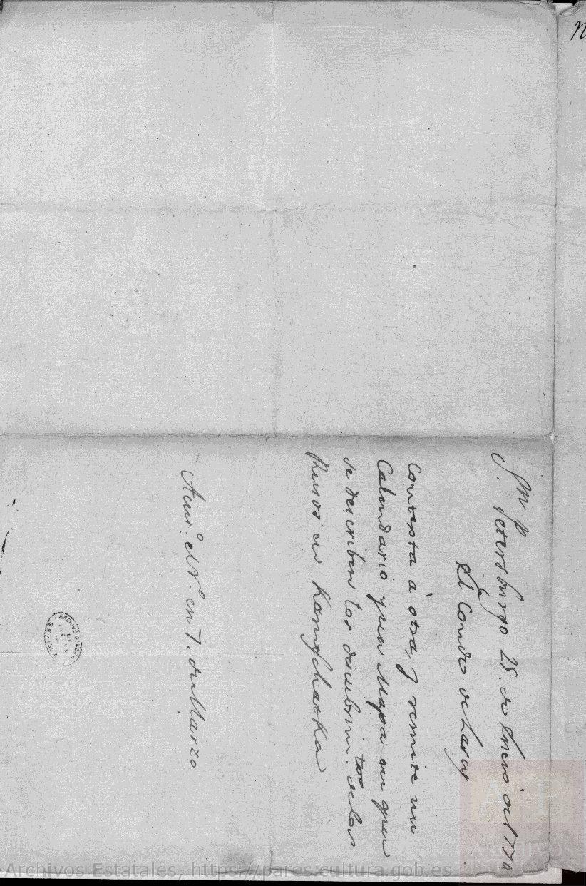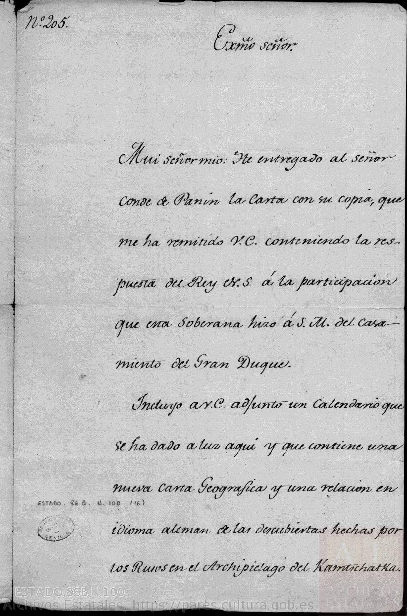 Carta nº 205 de Francisco Antonio de Lacy, conde de Lacy, a Jerónimo de Grimaldi, marqués de Grimaldi, secretario de Estado, remitiendo el "Calendario geográfico para el año de Christo de 1774. San Petersburgo. Impreso por la Academia Real de las Ciencias. Sucinta relación del Archipiélago del Norte nuevamente descubierto", firmado por Jakov von Stählin, un mapa (MP-MEXICO,526BIS) y una relación en alemán de los descubrimientos hechos por los rusos en el archipiélago de Kamtschatka, fechado el 25 de enero de 1774.