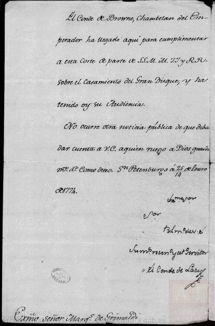 El Conde de Browne, Chambelán del Emperador, ha llegado aquí para cumplimentar a esta Corte de parte de S.S.M.M.I.I. y R.R. sobre el casamiento del Gran Duque, y ha tenido oy su Audiencia.