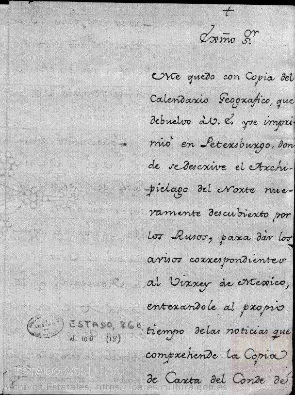 Me quedo con copia del Calendario Geográfico, que debuelvo a V.E. y se imprimió en Petersburgo, donde se describe el Archipiélago del Norte nuevamente descubierto por los Rusos, para dar los avisos correspondientes al Virrey de Méxivco, enterándole al propio tiempo de las noticias que comprehende la Copia de Carta del Conde de ...