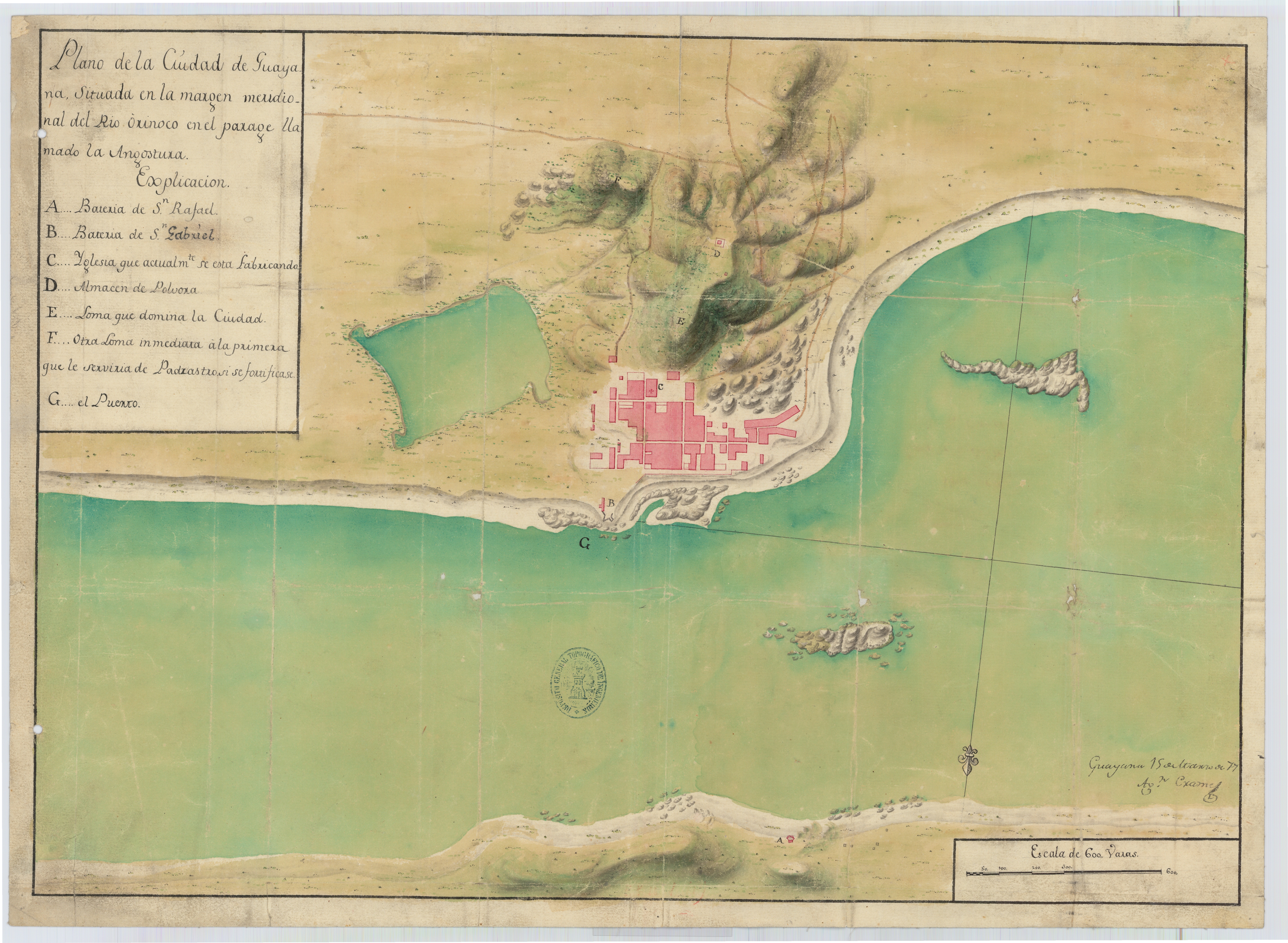 Crame descarta hacer ninguna fortificación en la desembocadura del Orinoco porque quedaría expuesta y no podría impedir que cualquier enemigo penetrase en el río. Una vez en él, la configuración de terreno en los primeros kilómetros no podría impedir su avance hasta llegar al castillo de San Francisco. Crame considera que la fortaleza, aunque de murallas débiles, mantiene un estado generale bueno y tan solo restaría completar su guarnición de 50 hombres y de artillería y municiones. Respecto a la cercana batería de San Diego, considera necesario reforzar sus defensas con un proyecto valorado de 2000 pesos para impedir que el enemigo pueda tomarla. El siguiente punto para reforzar son las defensas de la nueva ciudad de Guayana, de nombre Angostura, mediante diversas reparaciones en la batería de San Gabriel, el emplazamiento en esta batería de seis cañones de a 8 y ocho cañones de a 4, y otros cuatro de a 4 en la batería de San Rafael.
