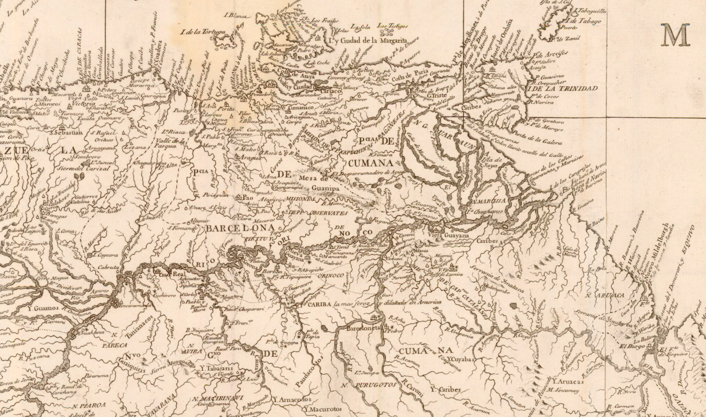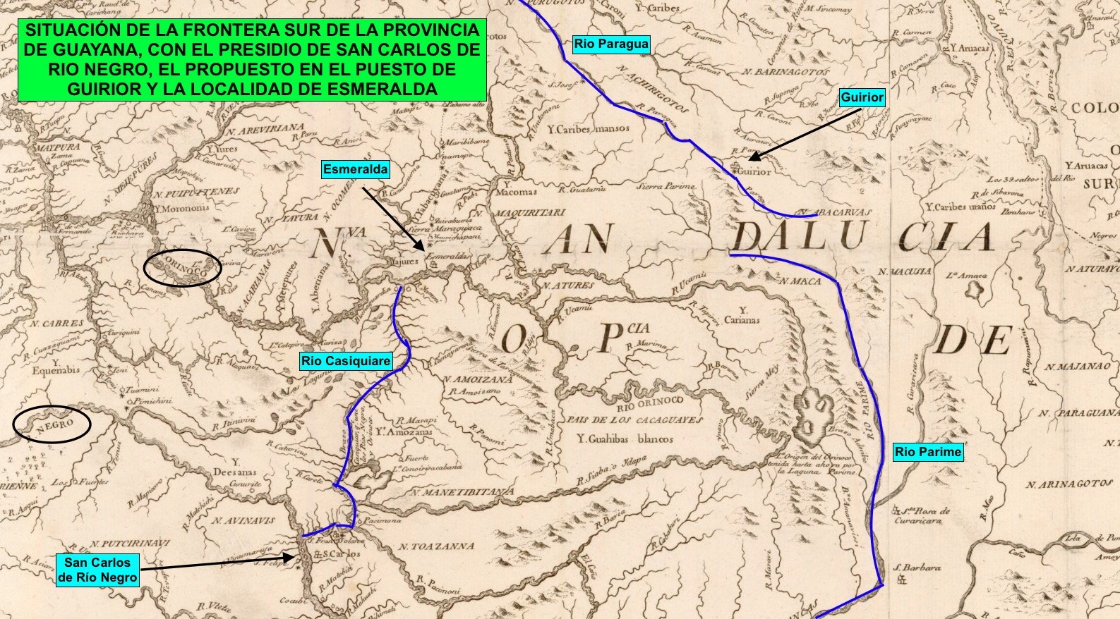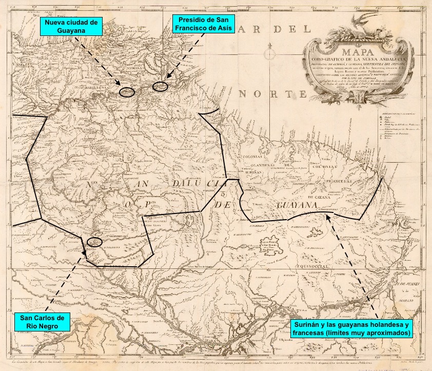 El presidio de San Carlos de Río Negro, a orillas de este río en plena selva amazónica. Era el puesto español avanzado situado más al sur, a unos 800 km en línea recta de la nueva ciudad de Guayana. Su misión era mantener controlada la frontera con los dominios portugueses, quienes constantemente trataban de penetrar en el territorio español para expandierse hacia el norte.