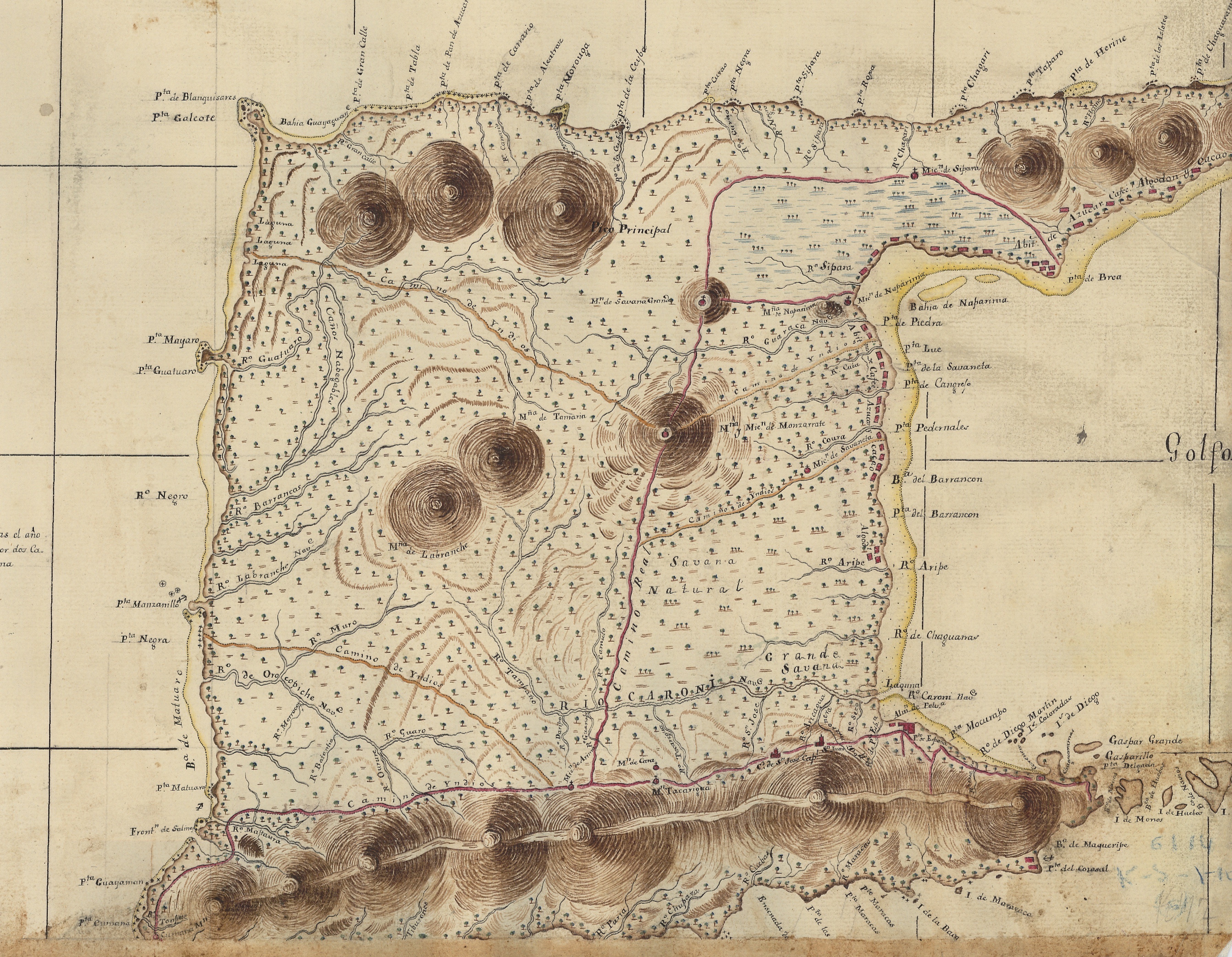 En la Costa del Este no hay el menor abrigo: todas las Embarcaciones huyen de ella, y en particular las que salen de Orinoco: En esta costa que casi toda es llana, hay también cantidad de arroyos, y algunos que merecen el nombre de Ríos. Como el de Guatuaro, y Nariba: cerca de este último hay en la misma Playa dos grandes cocales que tienen de largo de tres a cuatro Leguas.