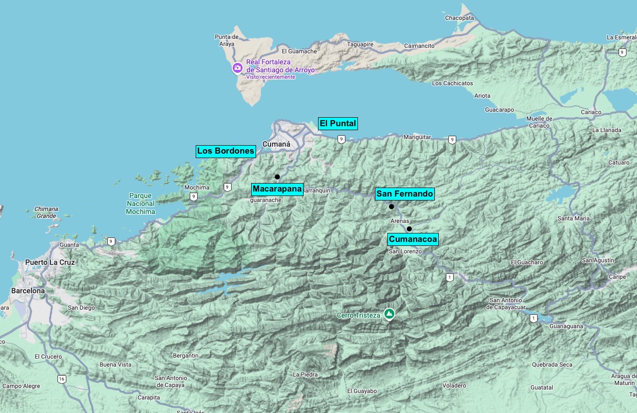 "CUMANA es la Ciudad Capital de esta Provincia, situada en la tierra firme, a dos leguas de la Mar entre un bosque espeso: tiene esta Ciudad una Rada sobre el Mar mui comoda en una Bahia bien limpia, sin peñasco alguno, con 14 brazas de profundidad: no está mui poblada; sus habitantes son dóciles, los que habitan en las costas; pero los de tierra adentro mui feroces.