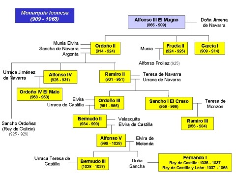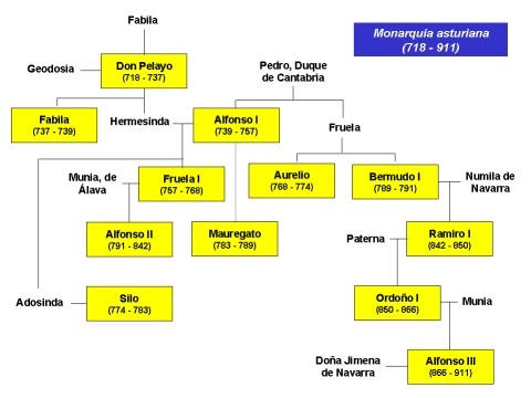 MONARQUÍA ASTUR-LEONESA (718 - 1037) Una dinastía de 12 reyes descendientes o emparentados con Pedro, Duque de Cantabria, que gobernaron el pequeño reino de Asturias y sobrevivieron con éxito a las numerosas expediciones mulitares que los gobernadores y emires Omeyas lanzaron contra ellos para destruirles. Finalmente, tras dos siglos de luchas contra los musulmanes, el reino de Asturias llegó hasta las orillas de Duero en época del rey Alfonso III El Magno, dando origen a un nuevo reino que fue gobernado durante ciento cincuenta años por otros 12 reyes, hasta que se unió al reino de Castilla por primera vez bajo Fernando I en 1037. |