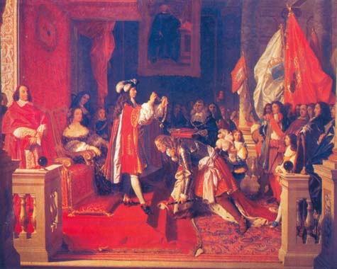 El duque de Berwick recibe de Felipe V el Toisón de Oro. Cuadro de Jean Auguste Ingres. Palacio de Liria. Madrid Con ocasión de la invasión de las tres provincias vascongadas al frente de un ejército francés en 1718, uno de sus hijos, el duque de Liria, luchaba al servicio de Felipe V. Berwick escribió a su hijo que "cualquier cosa que suceda recuerda lo que te he dicho muchas veces. Tú eres un español, obligado por honor a permanecer fiel al rey de España".. Con anterioridad, en 1715, había rechazado el mando de las fuerzas jacobitas, para seguir como un eficaz servidor de Francia. En 1731 participó al frente del ejército francés en la ocupación de Parma por las tropas españolas en beneficio del Infante don Carlos, futuro Carlos III de España. Con ocasión de la Guerra del Primer Pacto de Familia por la sucesión al trono de Polonia, el duque cruzó el Rhin en octubre de 1733 e invadió Alemania. En 1734, durante el asedio de Philippsburg, en la guerra de Sucesión de Polonia, un proyectil de cañón lo dejó muerto en el campo. |