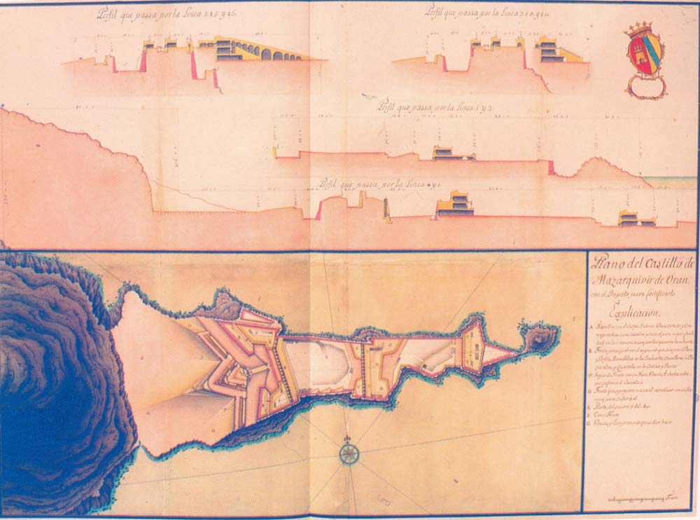 Plano con las defensa construidas por los ingenieros españoles en la plaza de Orán a partir de 1732. La operación quedó en manos del primer ministro Patiño que, como siempre, la llevó a cabo con exquisita eficiencia. Para ello organizó una fuerza militar de 30.000 hombres que embarcaron en un gran número de barcos de transporte escoltados por una flota de 12 navíos de guerra y 7 galeras. El mando de la expedición se otorgó al conde de Montemar. La flota partió de Alicante el 15 de junio de 1732 y cruzó el Estrecho. No se informó del objetivo de los preparativos hasta que zarpó la flota, momento en que el rey publicó en Sevilla un decreto haciendo públicas sus intenciones. Orán resistió poco tiempo. Tanto la fortaleza como el vecino pueblo de Mazalquivir fueron ocupados después de seis dias. Se desconoce el número de bajas españolas, pero el embajador británico, Keene, las estimó en unos 3.000 hombres muertos y heridos. La noticia llegó a Sevilla el 8 de julio y dió lugar a grandes fiestas, en las que la Giralda resplandeció con fuegos artificiales. A mediados de agosto el rey otorgó el Toisón de Oro a su ministro Patiño y al conde de Montemar. A pesar del éxito, la conquista reportó poca seguridad a la seguridad y navegación española en el Mediterráneo, pues Gibraltar seguía en manos británicas. A partir de 1732 los ingenieros españoles trabajaron en las defensas de la plaza, de tal manera que la ciudad llegó a albergar una Academia de Matemáticas regida de modo similar a la de Barcelona. En ella trabajaron los siguientes ingenieros: