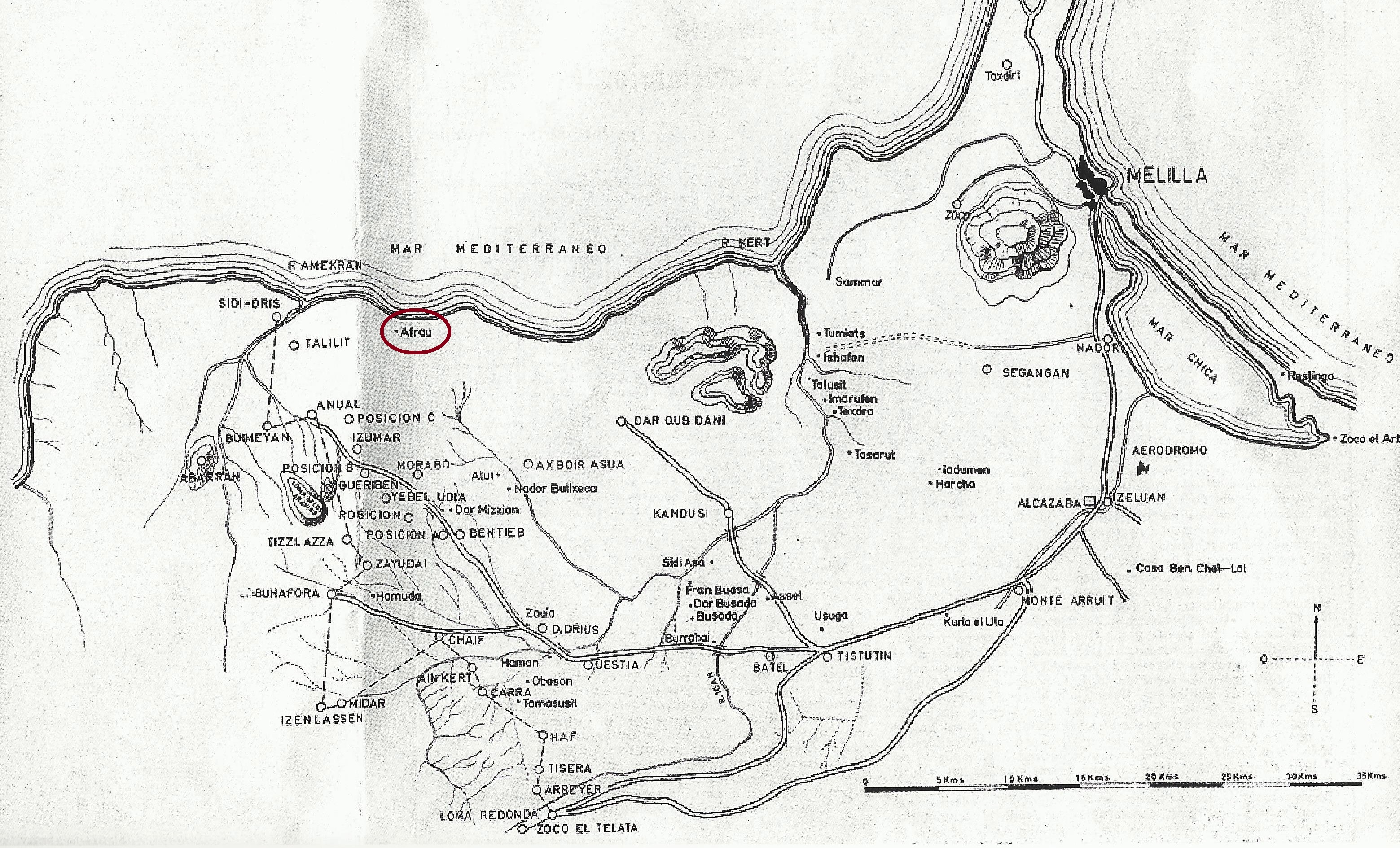 Por la tarde del 22 de julio un grupo de rifeños se aproximó a la posición enarbolando una bandera española. Amparados en ella, atacaron al destacamento de protección de la aguada, compuesto por siete soldados y diez policías, y se apoderaron de él. En el transcurso de los acontecimientos el sargento de la Policía Indígena y practicamente la mitad de los policías desertaron de la posición. Posteriormente se presentaron seis soldados españoles sin el armamento. Al día siguiente por la mañana, 23 de julio, el teniente Gracia ordenó la retirada del puesto de la avanzadilla, en cuya ejecución el teniente resultó muerto mientras apuntaba un cañón asentado para la protección de la retirada, quedando al mando de la posición el teniente Vara de Rey. El asedio continuó el resto del día, intentando por la noche repetidos ataques sobre la posición, y llegando en algunos ataques hasta las alambradas. El 24 de julio el general Berenguer, puesto en contacto con la posición a través de los buques de la Armada, autorizó la evacuación de la posición. No obstante, el cañonero "Laya" tuvo que ausentarse de aquellas aguas para acudir en ayuda de Sidi Dris, por lo que la posición de Afrau continuó bajo el asedio de los rifeños el resto del día 24 y todo el día siguiente 25 de julio. Tras la caida de Sidi Dris, el cañonero "Laya" regresó frente a Afrau el 25 de julio por la tarde. En la madrugada del 26 de julio lo hicieron el "Princesa de Asturias" y el "Roger de Lauria". El teniente Vara de Rey decidió que era el momento de intentar una salida sorpresa hacia el mar. Para ello ordenó salir una vanguardia formada por 15 soldados y 11 policías, una sección flanqueando ambos lados del camino, otra sección en ecentro con los heridos, y el resto de la fuerza detrás al mando del citado teniente. En la posición quedó un sargento con 15 soldados y 15 policías para proteger la retirada. Nada más salir, los rifeños se echaron sobre la vanguardia y roderon al resto, por lo que el teniente Vara de Rey ordenó dirigirse directamente y recto hacia el mar, caminando sobre las rocas del arrecife y metidos en el agua. Allí contuvieron el fuego enemigo y aguantaron hasta la llegada de los botes de los buques de la Armada quienes, apercibidos, echaron sus botes al agua y lograron recoger, en varios viajes, a unos 130 hombres del total de 180 aproximadamente que constaba la guarnición. De los 130 hombres evacuados, unos 40 estaban heridos; en la posición quedaron unos 50 muertos o prisioneros. Este es el relato de lo ocurrido a esta posición que recoge el general Picasso en su resumen (capítulo VIII): Destacado, en virtud de orden urgente del Comandante General, a las aguas de Sidi-Dris el cañonero “Laya”, adonde llega en la mañana del 20 [de julio], observando normalidad, sobre las diez y treinta del 22 [de julio] –folio 907- recoge, como resultado de la conferencia mantenida por dicha autoridad con el Alto Comisario, el radiograma que le dirige el Comandante General comunicando la resolución de la retirada de las tropas de Annual sobre Ben-Tieb –folio 1995-, de que en su lugar queda hecha mención, con el encargo directo a dicho buque de proteger a la guarnición de Sidi-Dris y a la de Talilit, que se replegaría sobre la primera; según el parte del comandante del expresado cañonero –folio 908-, a las catorce [horas] del 22 [de julio] empezó a manifestarse agitación en los aledaños de Sidi-Dris, empezando el asedio con algún tiroteo, sin que el ataque en las primeras veinticuatro horas fuera muy enérgico. Mas, en suma, produjo el efecto de estorbar la aguada, apretando el enemigo el cerco y la hostilidad progresivamente en forma de apurar los recursos de la posición. [...] En telegrama del mismo día [22 de julio]–folio 2005- se comunica también a la Comandancia General ser atacada Afrau, y en telegrama de las diez y cuarenta del 23 [de julio] se la manifiesta haberse dispuesto marche a sus aguas un cañonero, a fin de cooperar a la aguada de la posición; esperando se extremaría la resistencia y sólo agotados todos los medios se refugiara la guarnición en el buque. [...] Tanto el jefe de la posición de Sidi-Dris –folio 2015- como el comandante del “Princesa” –folio 2016- encarecen el envío urgente de fuerzas, si se quieren sostener las posiciones, la citada y Afrau; pues de lo contrario, dice el último, tendrían que ser evacuadas, operación la cual consideraban ofrecer graves riesgos, sobre todo para el personal de aquella. El Alto Comisario, en telegrama del 24 [de julio], de las 14-15 –folio 1017-, contesta que, dada la situación de las guarniciones de Sidi-Dris y Afrau, puede disponerse la evacuación con auxilio de los otros buques, si se juzgase factible, y en la forma que hubo de manifestar. [...] Perdida la posición de Sidi-Dris, trasladóse el “Laya” a Sidi-Mosain-Afrau, siguiendo luego a ella el “Princesa” y el “Lauria” –folio 2027- a comunicar la autorización concedida por el Alto Comisario para parlamentar con el enemigo si no podía efectuar la evacuación –folio 910 vuelto-, advirtiendo el jefe de la posición de los términos en que ésta pudiera llevarse a cabo, sin obtener respuesta, por la falta de medios acordes entre el buque y la posición existían, pasando el tiempo, dice el comandante, sin oír más que algún tiro suelto enemigo y ninguno de los nuestros. Supuso el comandante pudiese estar la posición abandonada o no tener municiones. En la noche recibió el “Laya” estaciones de telegrafía óptica y personal de Ingenieros del Ejército para su manejo. A las diez y treinta y cinco del 23 [de julio] la Comandancia general había avisado a los buques, que Sidi-Hosain comunicaba estar algo apurada por falta de agua, indicando la necesidad de acudir en su auxilio protegiendo la aguada, y aun recogiendo a la guarnición si ésta no pudiera sostenerse. Al amanecer del día 26 [de julio] pud