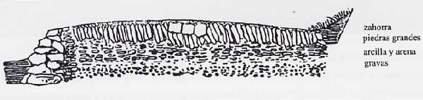 El terreno natural, primeramente, se cubría con una ligera capa de arena o mortero, y sobre ésta, otra capa (de 25 a 60 cm. de espesor) de piedras planas, llamada statumen.