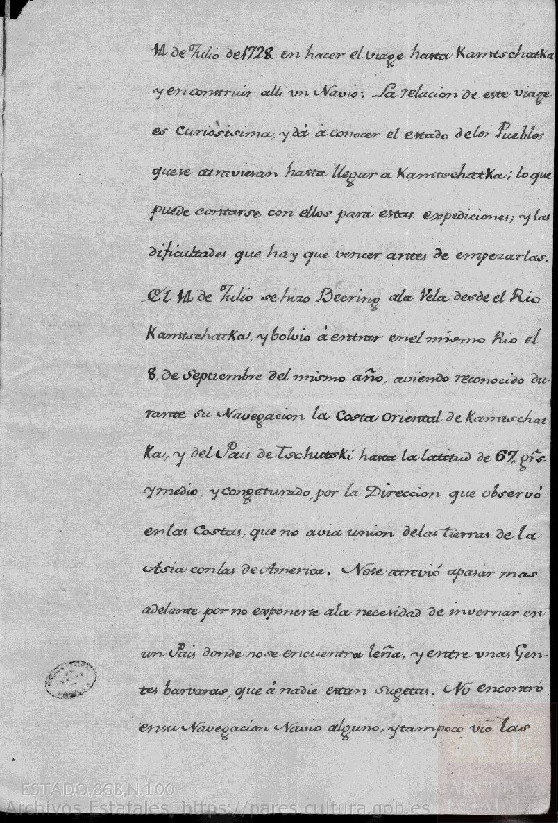 Ynstruido Beering de su Comisión partió de Petersburg el 5 de febrero de 1725, y empleó hasta 14 de julio de 1728 en hacer el viage hasta Kamtschatka y en construir allí un Navío: La relación de este viage es curiosísima, y da a conocer el estado de los Pueblos que se atraviesan hasta llegar a Kamtschatka; lo que puede contarse con ellos para estas expediciones; y las dificultades que hay que vencer antes de empezarlas. El 14 de Julio se hizo Beering a la Vela desde el Río Kamtschatka, y bolvió a entrar en el mismo Río el 8 de septiembre del mismo año, aviendo reconocido durante su navegación la Costa Oriental de Kamtschatka, y del País de Tschutski hasta la altitud de 67 grados y medio, y congeturado, por la Dirección que observó en las Costas, que no avía unión de las tierras de la Asia con las de América. No se atrevió a pasar más adelante por no exponerse a la necesidad de invernar en un País donde no se encuentra leña, y entre unas Gentes barvaras, que a nadie están sugetas.